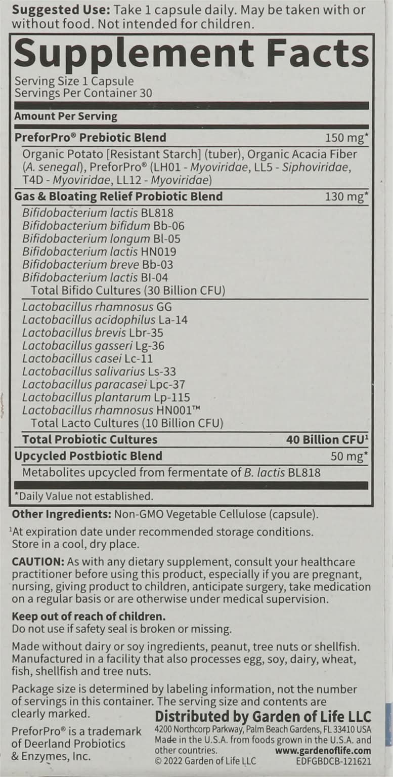 Ingredients: Preforpro Prebiotic Blend: Organic Potato [Resistant Starch] (Tuber), Organic Acacia Fiber (A. Senegal), Preforpro (LH01 - Myoviridae LL5 - Siphoviridae T4D - Myoviridae LL12 - Myoviridae). Gas & Bloating Relief Probiotic Blend: Bifidobacterium Lactis BL818, Bifidobacterium Bifidum Bb-06, Bifidobacterium Longum Bl-05, Bifidobacterium Lactis HN019, Bifidobacterium Breve Bb-03, Bifidobacterium Lactis BI-04, Total Bifido Cultures (30 Billion CFU): Lactobacillus Rhamnosus GG, Lactobacillus Acidophilus La-14, Lactobacillus Brevis Lbr-35, Lactobacillus Gasseri Lg-36, Lactobacillus Casei Lc-11, Lactobacillus Salivarius Ls-33, Lactobacillus Paracasei Lpc-37, Lactobacillus Plantarum Lp-115, Lactobacillus Rhamnosus HN001, Upcycled Postbiotic Blend: Metabolites Upcycled from Fermentate of B, Lactis BL818. Other Ingredients: Non-GMO Vegetable Cellulose (Capsule) Contains: Eggs, Soybeans, Wheat, Fish, Crustacean Shellfish, Tree Nuts, Milk, Molluscan Shellfish