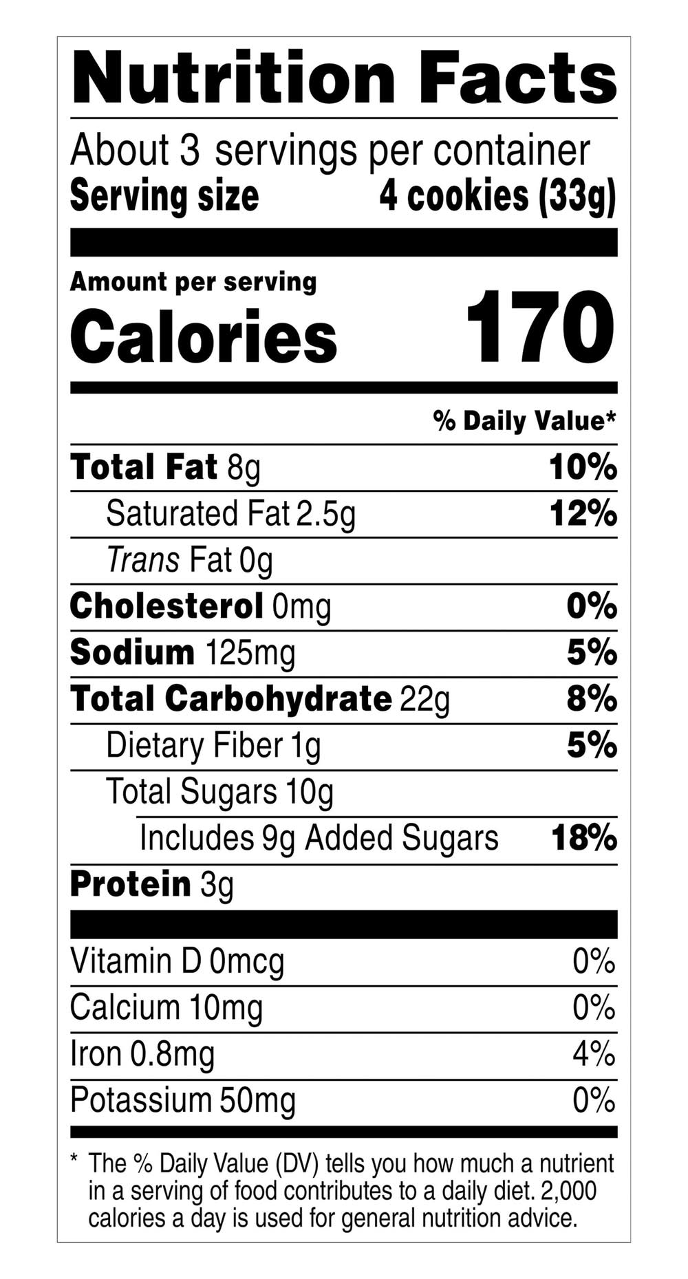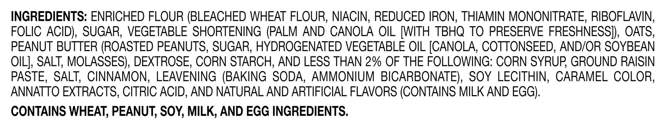 Ingredients: Enriched Flour (Bleached Wheat Flour, Niacin, Reduced Iron, Thiamin Mononitrate, Riboflavin, Folic Acid), Sugar, Vegetable Shortening (Palm and Canola Oil [with TBHQ to Preserve Freshness]), Oats, Peanut Butter (Roasted Peanuts, Sugar, Hydrogenated Vegetable Oil [Canola, Cottonseed, and/or Soybean Oil], Salt, Molasses), Dextrose, Corn Starch, and Less than 2% of the Following: Corn Syrup, Ground Raisin Paste, Salt, Cinnamon, Leavening (Baking Soda, Ammonium Bicarbonate), Soy Lecithin, Caramel Color, Annatto Extracts, Citric Acid, and Natural and Artificial Flavors (Contains Milk and Egg) Contains: Wheat, Oat, Peanuts, Soybeans, Corn, Milk, Eggs, Tree Nuts