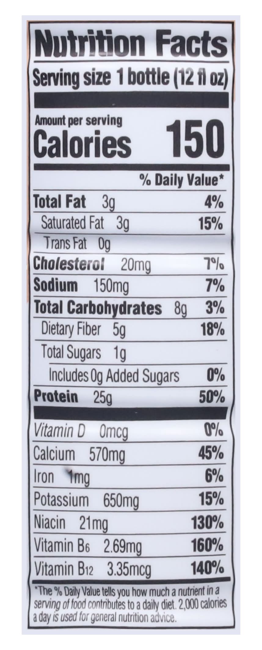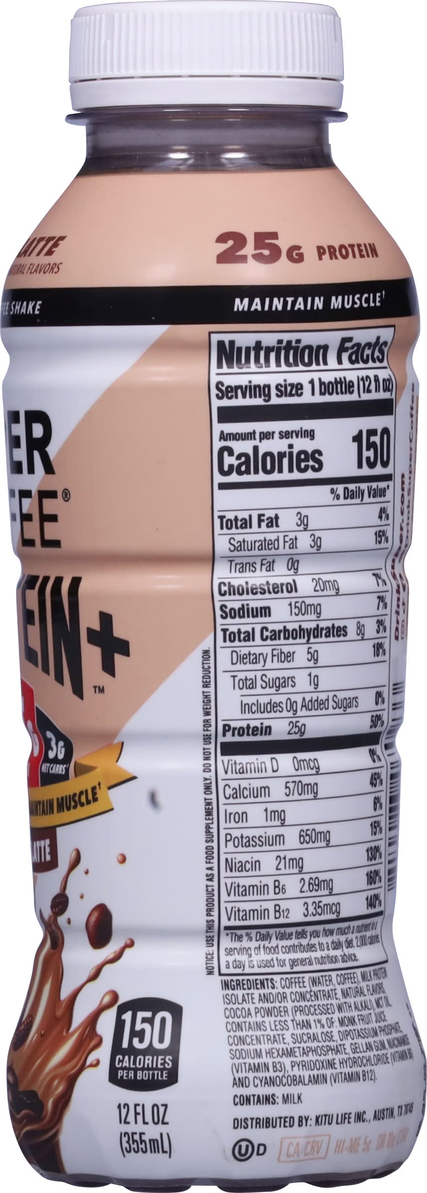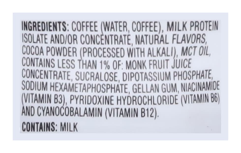 Ingredients: Coffee (Water, Coffee), Milk Protein Isolate and/or Concentrate, Natural Flavors, Cocoa Powder (Processed with Alkali), Mct Oil, Contains Less than 1% of: Monk Fruit Juice Concentrate, Sucralose, Dipotassium Phosphate, Sodium Hexametaphosphate, Gellan Gum, Niacinamide (Vitamin B3), Pyridoxine Hydrochloride (Vitamin B6) and Cyanocobalamin (Vitamin B12) Contains: Milk