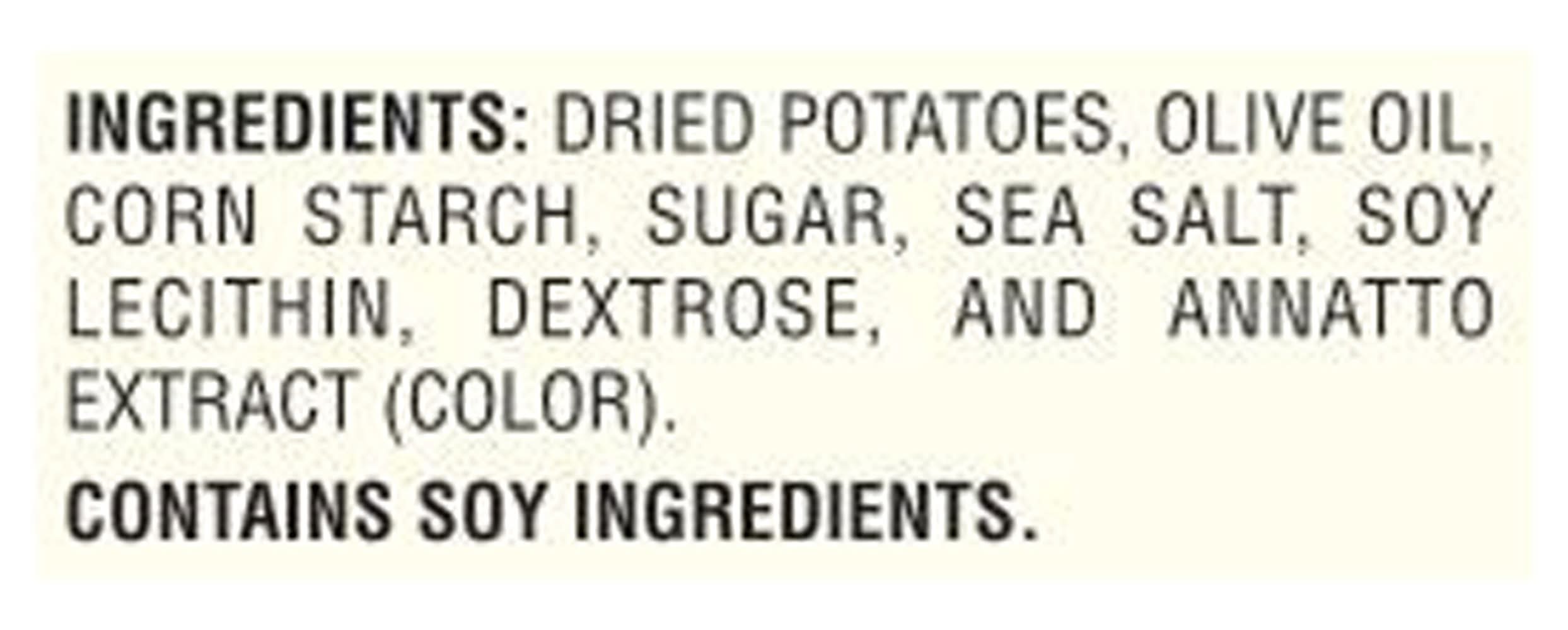 Ingredients: Dried Potatoes, Olive Oil, Corn Starch, Sugar, Sea Salt, Soy Lecithin, Dextrose, and Annatto Extract (Color) Contains: Soybeans, Corn
