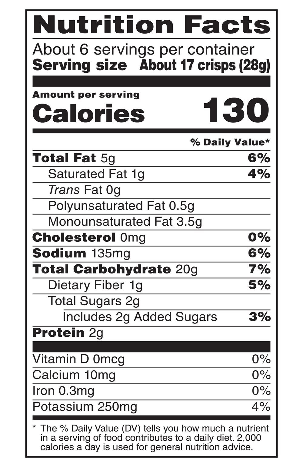 No artificial flavors or preservatives. 0 g zero grams trans fat. Gluten free. 65% less fat than regular potato chips (65% less fat than regular potato chips fat content of regular potato chips is 10 g per 1 oz, serving; fat content of these snacks is 3.5 g per 1 oz, serving). Full flavor. 100% crispy goodness. Frito-lay, Inc., Plano,TX.