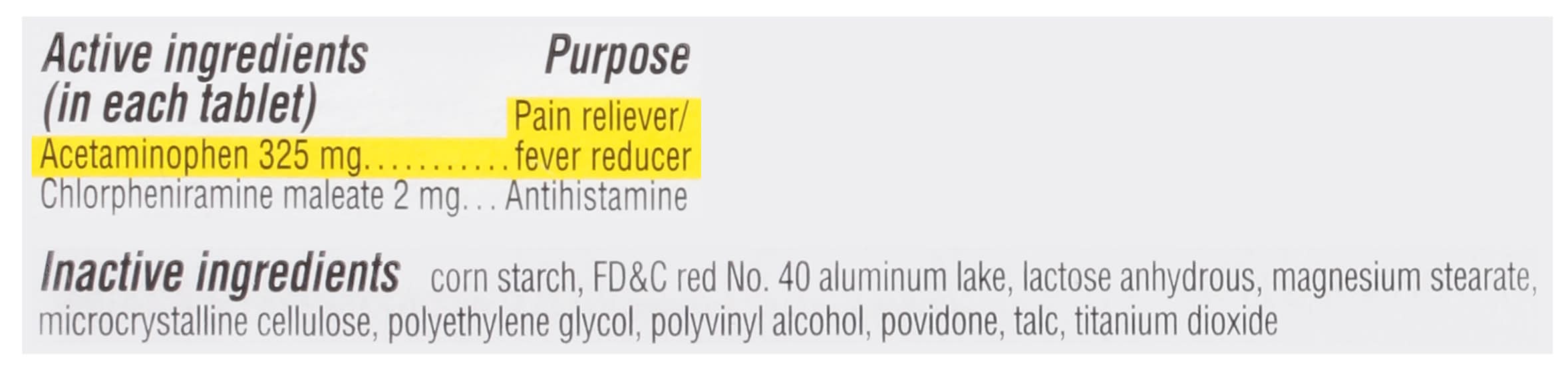 Ingredients: In Each Tablet: Active Ingredients: Acetaminophen (325 mg), Pain Reliever/Fever Reducer; Chlorpheniramine Maleate (2 mg), Antihistamine. Inactive Ingredients: Corn Starch, FD&C Red 40 Aluminum Lake, Lactose Anhydrous, Magnesium Stearate, Microcrystalline Cellulose, Polyethylene Glycol, Polyvinyl Alcohol, Povidone, Talc, Titanium Dioxide Additives: Inactive Ingredients: Corn Starch, FD&C Red No. 40 Aluminum Lake, Lactose Anhydrous, Magnesium Stearate, Microcrystalline Cellulose, Polyethylene Glycol, Polyvinyl Alcohol, Povidone, Talc, Titanium Dioxide.