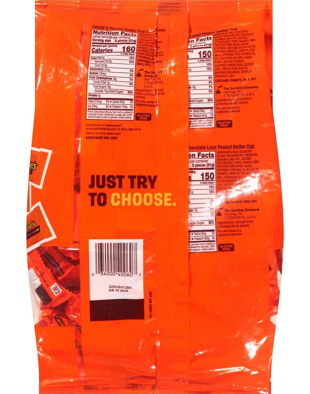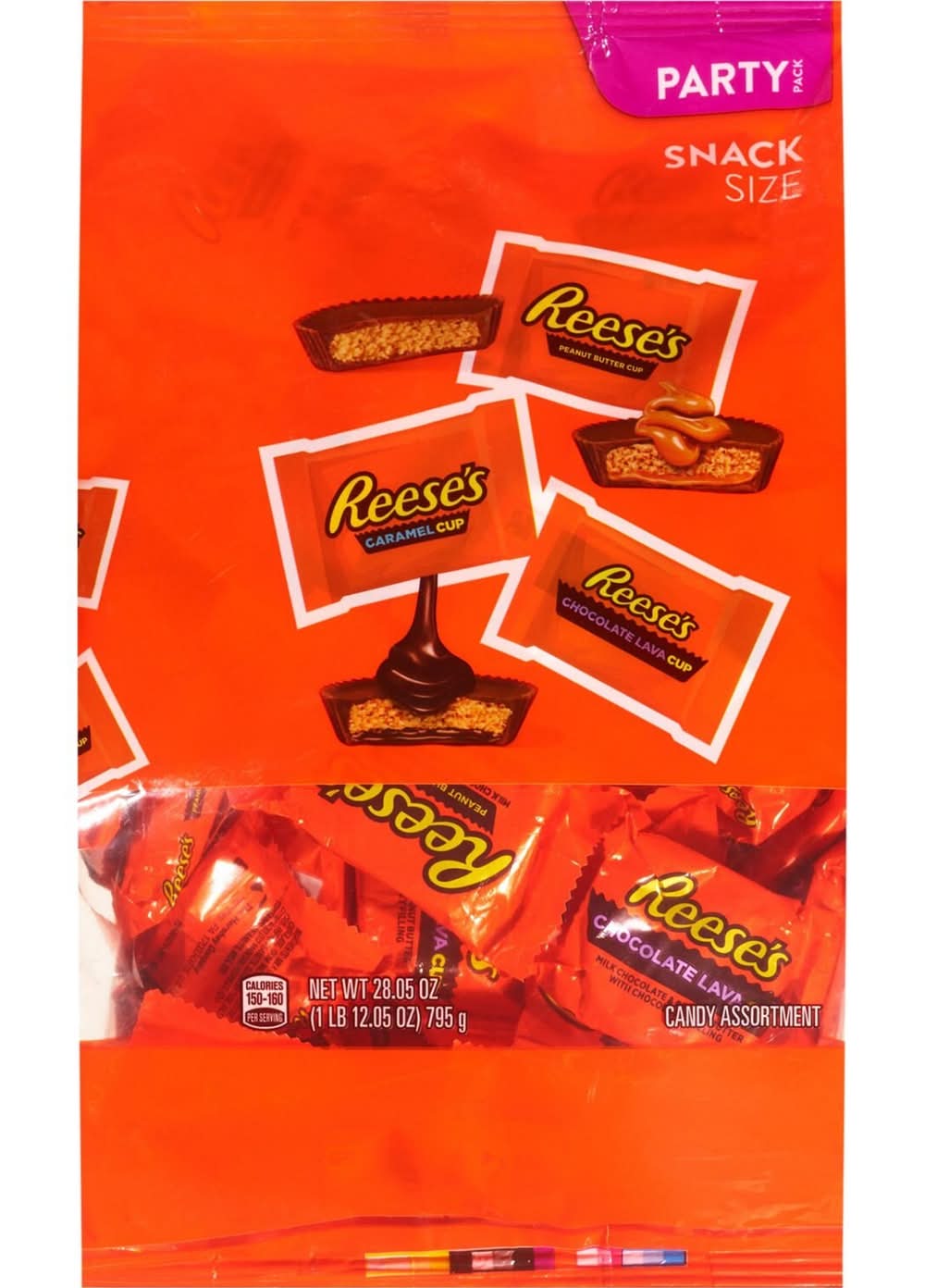 Get ready to taste perfection! You can't beat the old-fashioned, match-made-in-heaven when it comes to creamy milk chocolate combined with delicious peanut butter, now in assorted, decadent flavors. This assortment bag includes reese's milk chocolate peanut butter cups, REESE'S caramel milk chocolate peanut butter cups and reese's chocolate lava milk chocolate peanut butter cups, all in snack size pieces. Bring this party pack along to the next sporting event, party, movie marathon, game night and so many other activities for an extra bite of peanut butter goodness. Store this bag in your pantry to easily slip into lunch boxes and purses for a midday surprise. These reese's peanut butter cup candies are a sweet delight that you can bite, break, dunk or nibble on. Dunk them into a cold glass of milk, a cup of hot chocolate or your coffee to experience the melty goodness. Put a unique twist on cookies, cupcakes and ice cream sundaes with whole, halved or crumbled REESE'S cups. These kosher certified and gluten free treats go well with almost everything, especially during your holiday celebrations. Add them to Christmas stockings, Halloween candy bowls, Valentine's Day gift bags and Easter baskets. Just don't forget to save a few reese's peanut butter cups for yourself. Flavor: Assorted