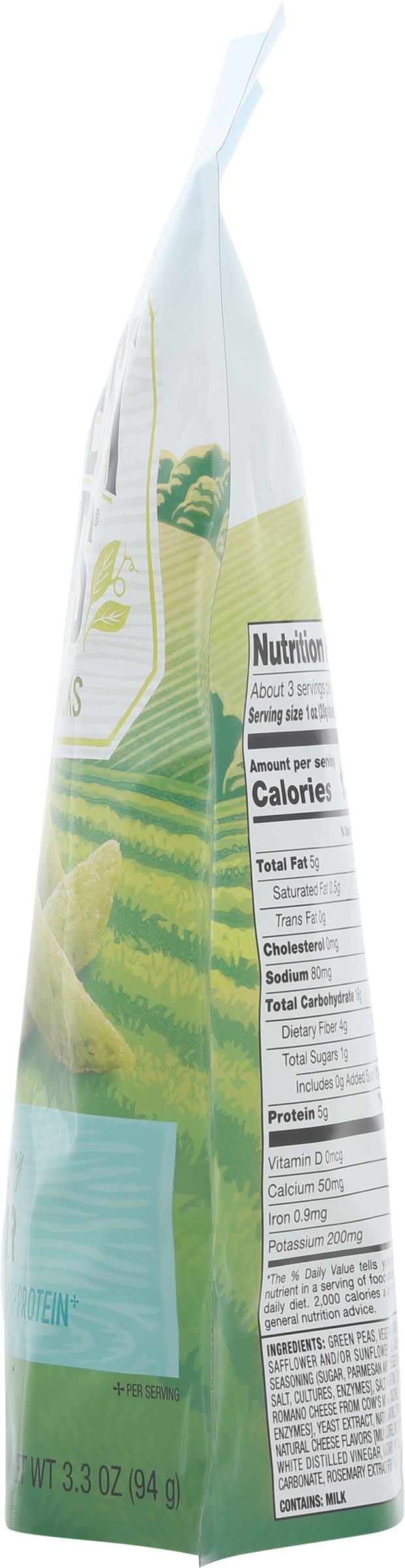 Ingredients: Green Peas, Vegetable Oil (Canola, Safflower and/or Sunflower Oil), Rice, Caesar Seasoning (Sugar, Parmesan and Blue Cheeses [Milk, Salt, Cultures, Enzymes, Salt, Maltodextrin, Cream, Romano Cheese from Cow's Milk (Milk, Cultures, Salt, Enzymes, Yeast Extract, Natural Flavors, Citric Acid, Natural Cheese Flavors (Milk, Cultures, Salt, Enzymes], White Distilled Vinegar, Mustard, Whey), Calcium Carbonate, Rosemary Extract (for Freshness) Contains: Milk, Mustard