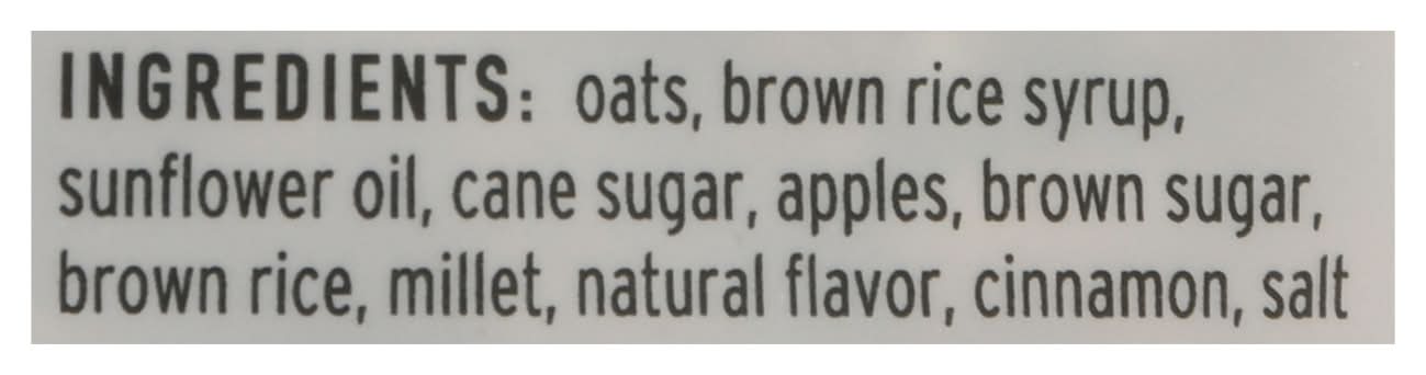 Ingredients: Oats, Brown Rice Syrup, Sunflower Oil, Cane Sugar, Apples, Brown Sugar, Brown Rice, Millet, Natural Flavor, Cinnamon, Salt Contains: Gluten, Peanuts, Milk, Eggs, Wheat, Soybeans, Fish