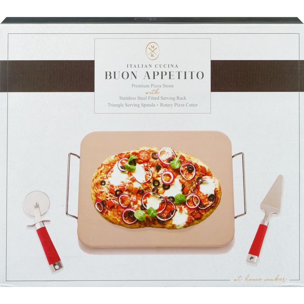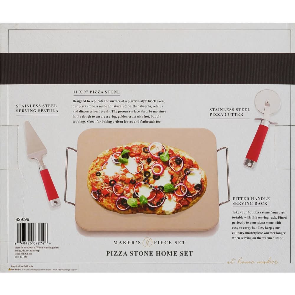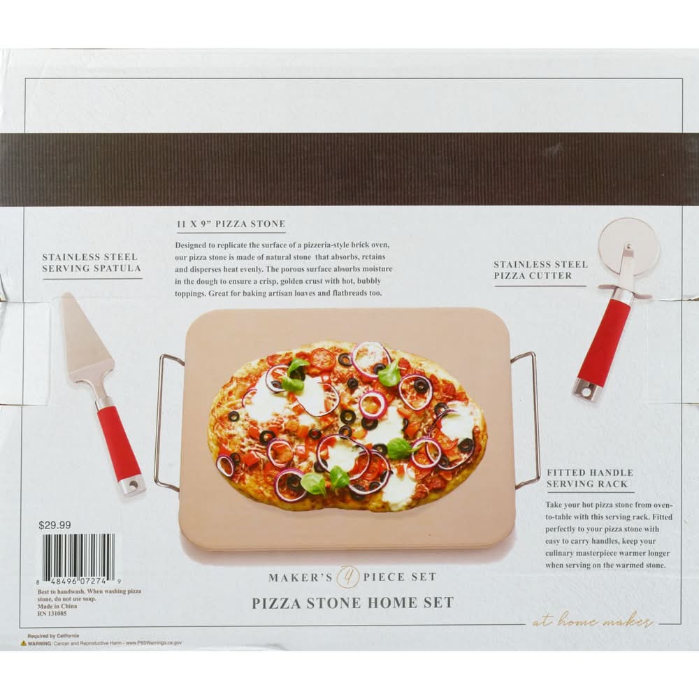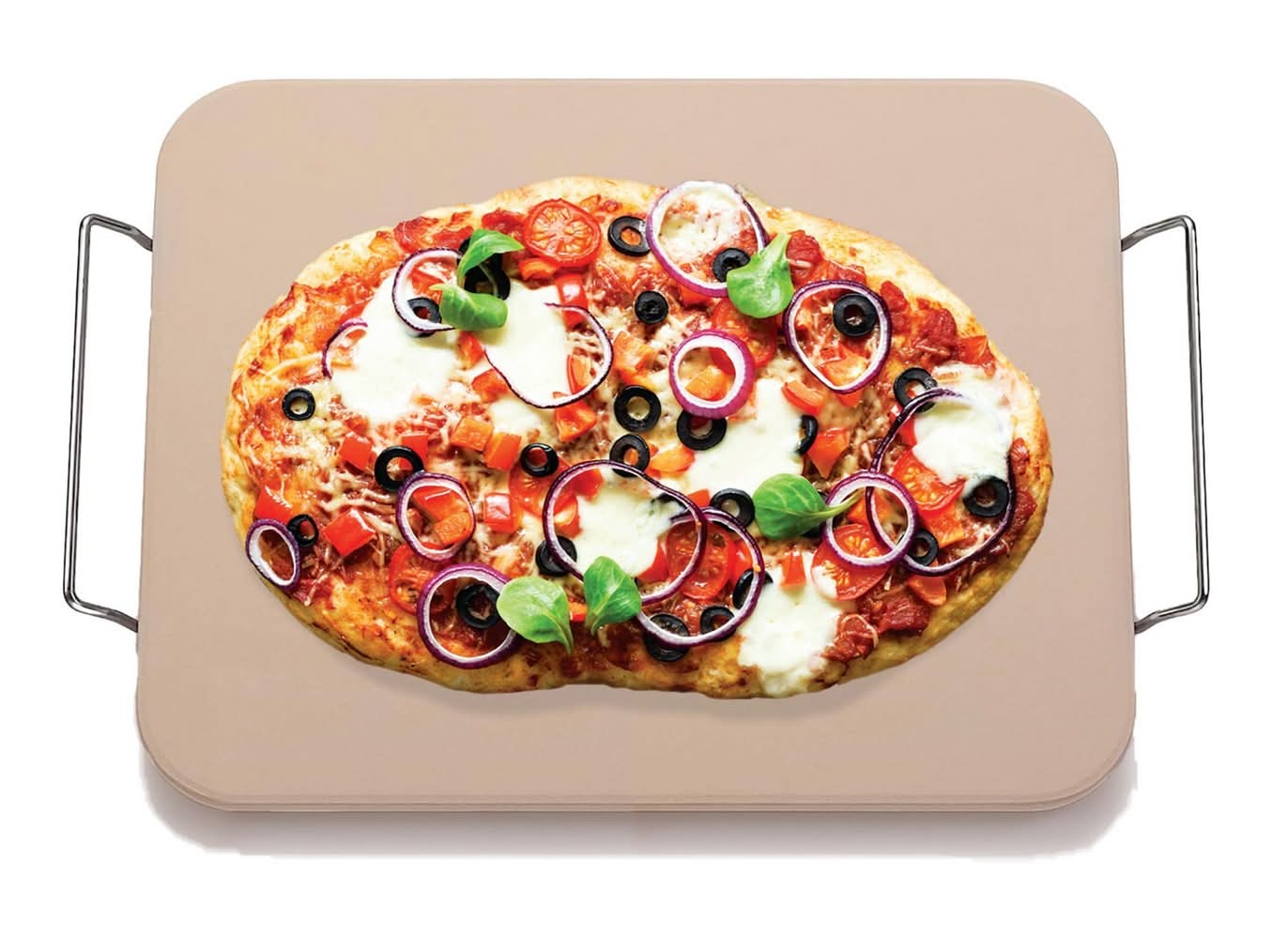 Designed to Replicate the surface of a pizzeria style brick oven,our pizza stone is made of natural stone that absorbs, retains and disperses heat evenly. The Porous surface absorbs moisture in the dough to ensure a crisp, golden crust with hot, bubbly toppings. Great for baking artisan loaves and flatbreads, too. 4-piece set 11" x 9" pizza stone Includes stainless steel utensils: spatula, pizza cutter, and serving rack Fitted-handle serving rack easily moves pizza stone