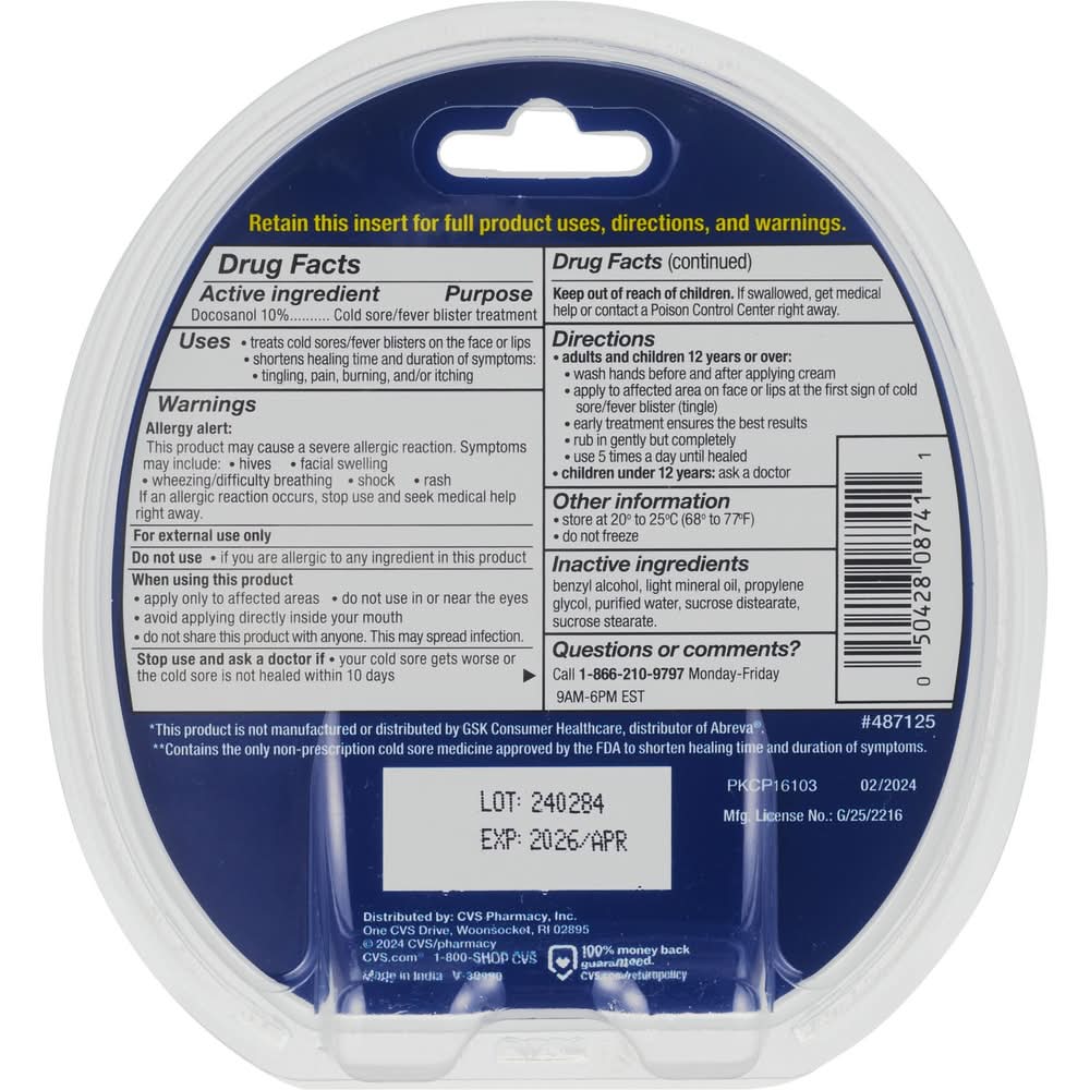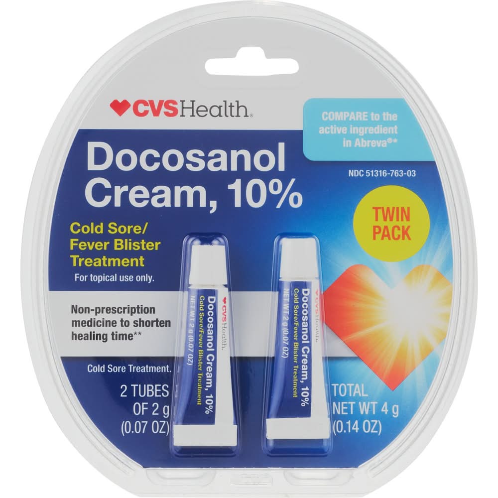 Relieve the discomfort and speed up the healing process of cold sores with CVS Health Docosanol 10% Cream. This topical cream contains the active ingredient docosanol, which helps reduce the duration and severity of cold sores caused by the herpes simplex virus. Lip cream for fever blisters packaged in a convenient tube for on the go cold sore treatment. Simply apply the cream to the affected area at the first sign of a cold sore for optimal results. CVS Health Docosanol 10% Cream provides soothing relief and aids in the healing of cold sores, allowing you to get back to feeling your best. CVS Health Cold Sore Treatment Maximum Strength is a powerful treatment for cold sores. It is specifically formulated to help relieve pain, reduce the duration of cold sores, and promote healing. The maximum strength formula contains active ingredients that target the cold sore virus, providing fast and effective relief. Available in a Twin pack that includes 2 tubes