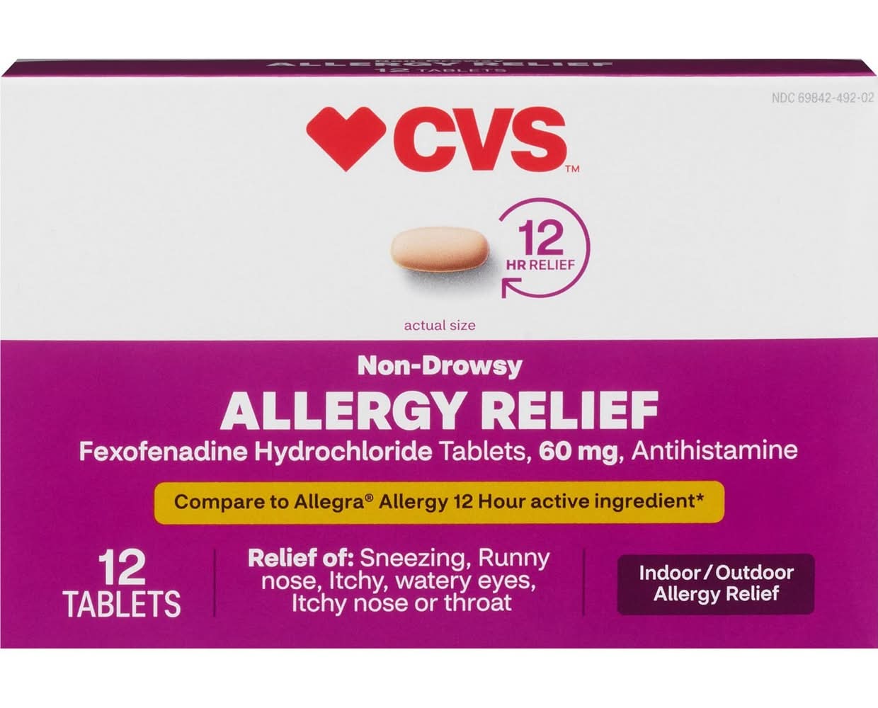 Get fast, effective relief from indoor and outdoor allergies with CVS Health Indoor and Outdoor Non-Drowsy Allergy Relief Tablets. These tablets are a non-drowsy allergy medication that will give you 12 full hours of relief from both indoor and allergy symptoms like sneezing, a runny or itchy nose or throat, and itchy, watery eyes. Each tablet is gluten free and gives you non-drowsy relief of allergy symptoms, so you can feel better as you go on about your day. This product is HSA and FSA (Flexible Spending Account) eligible. Use this product as directed per the product packaging instructions for the best results. It provides relief of symptoms due to hay fever or other upper respiratory allergies. When you're exposed to the same allergen twice, your antibodies can release a number of immune system chemicals, such as histamine, that cause allergy symptoms. This allergy medicine contains an antihistamine, which can help. Store this product in a cool, dry place at room temperature out of the reach of children and pets. If you have a medical condition, are pregnant or nursing, or currently taking prescription medication, consult with your doctor before using this product. When you purchase CVS Health products, you'll get the things you need to support your body's health and well-being along with our commitment to quality. HSA/FSA eligible product Indoor and outdoor allergy relief Antihistamine Gluten free CVS Health quality 12-count