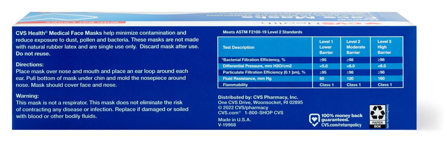 CVS Health Medical Face Masks are designed to help minimize contamination and reduce exposure to dust, pollen, and bacteria. These masks meet ASTM Level 1 standards and are proven to have a 99% bacterial filtration efficiency. They are non-sterile, intended for single use, and do not contain natural rubber latex. Users should discard the mask after use. The masks come with ear loops for ease of use and are crafted to be soft and breathable.