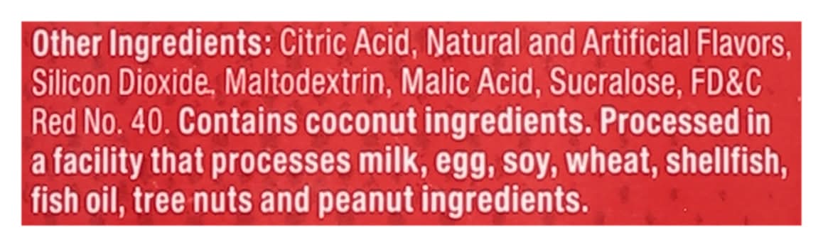 Ingredients: Citric Acid, Natural and Artificial Flavors, Silicon Dioxide, Maltodextrin, Malic Acid, Sucralose, FD&C Red 40 Contains: Tree Nuts, Coconuts, Milk, Eggs, Soybeans, Wheat, Crustacean Shellfish, Fish, Tree Nuts, Peanuts