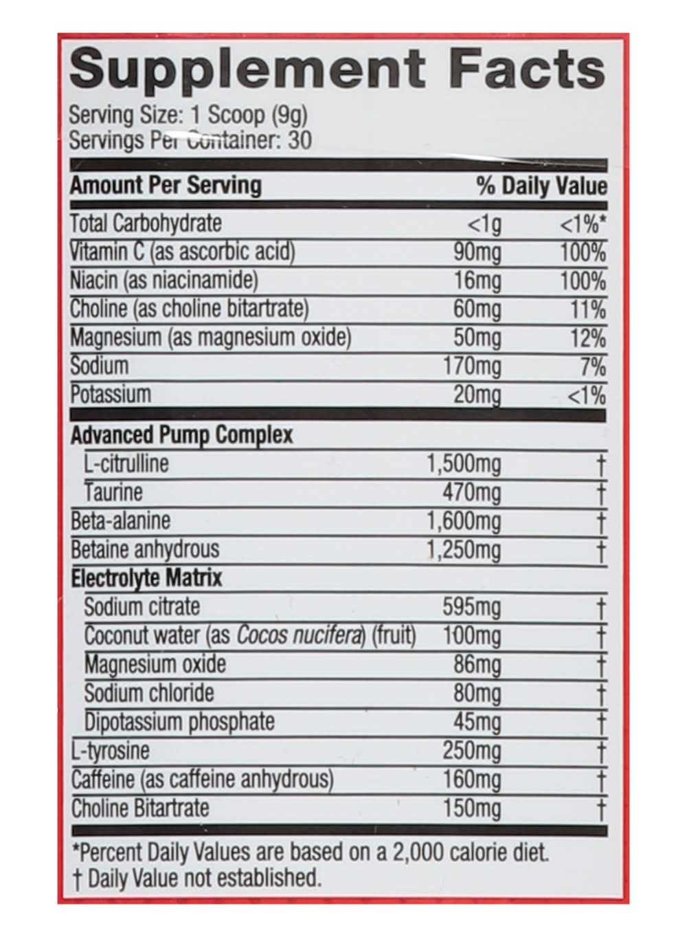 Directions for use: Directions: Read the entire label before use and follow the directions provided. Assess your tolerance by mixing 1 serving (1 scoop) with 6 oz. of cold water and drinking it about 30 minutes before your workout. Then increase the dosage to 2 serving mixed with 12 oz. of cold water before your workout. Do not exceed 2 servings (2 scoops) in a 24-hour period. Maintain an adequate state of hydration during use. - Directions: Directions: Read the entire label before use and follow the directions provided. Assess your tolerance by mixing 1 serving (1 scoop) with 6 oz. of cold water and drinking it about 30 minutes before your workout. Then increase the dosage to 2 serving mixed with 12 oz. of cold water before your workout. Do not exceed 2 servings (2 scoops) in a 24-hour period. Maintain an adequate state of hydration during use. Store in a cool, dry place (60 degrees F to 80 degrees F). For lot no. and expiry date: see bottle. Storage recommendation: Store in a cool, dry place (60 degrees F to 80 degrees F).