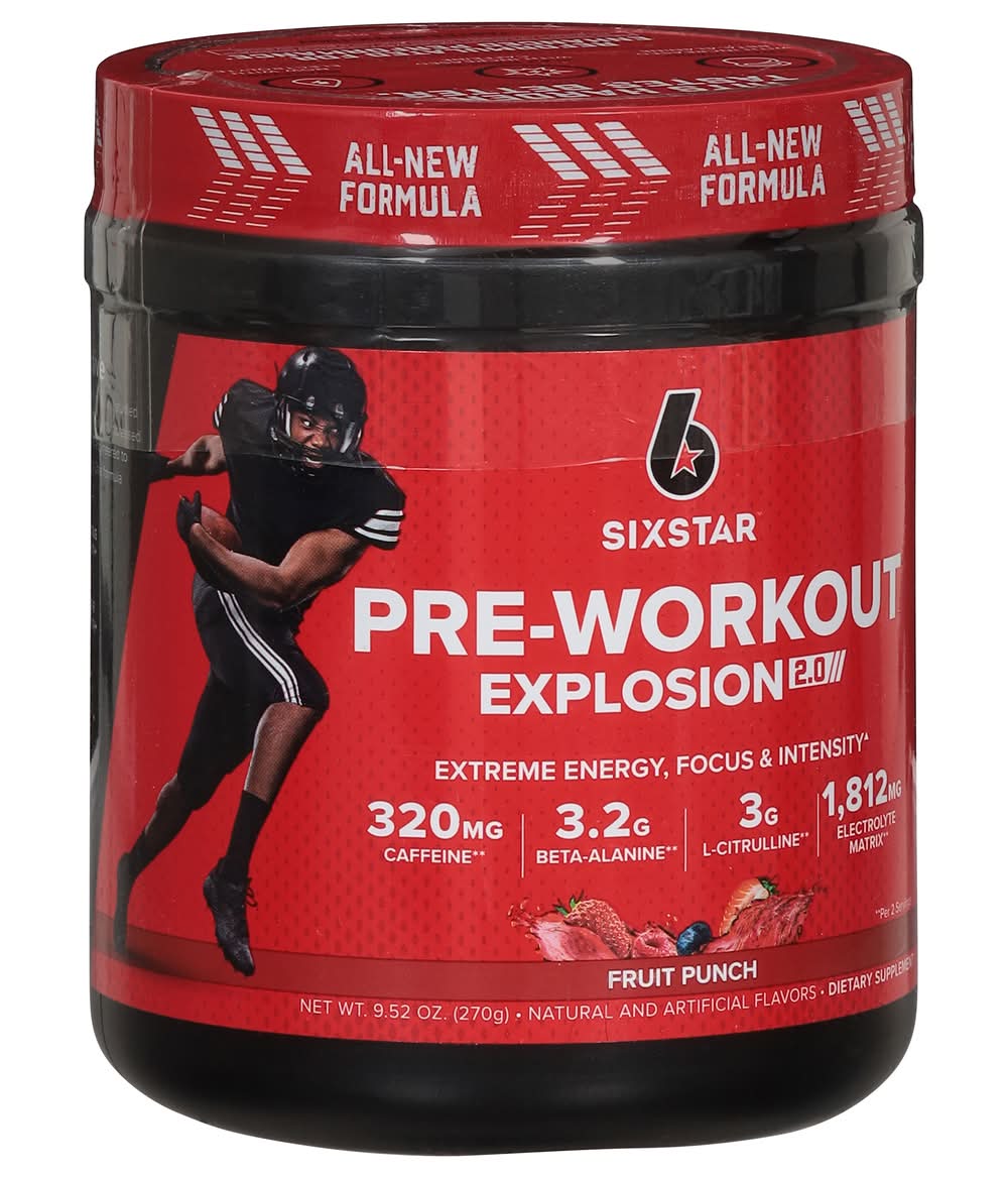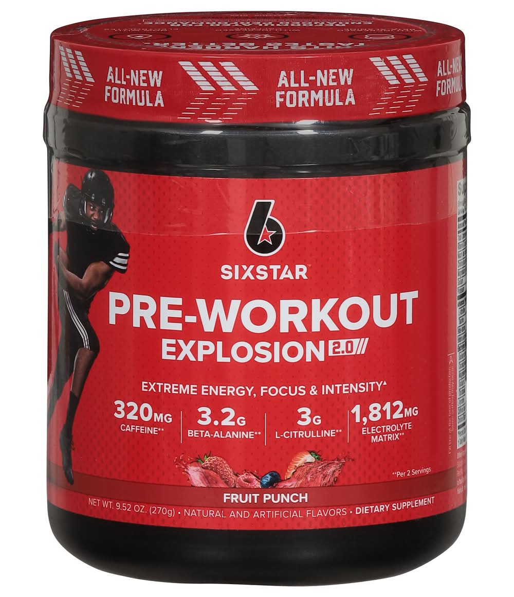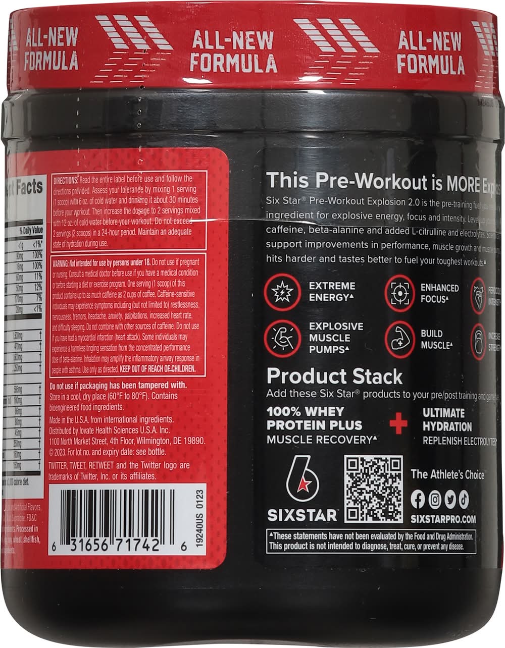 Six Star® Pre-Workout Explosion is precisely dosed with arginine AKG, beta-alanine, creatine and caffeine to provoke peak performance. Beta-alanine t increases muscle carnosine levels and, as a result, buffers lactic acid, so you can train longer. Arginine is an amino acid and a great vasodilator, which means it improves your blood flow and makes your pumps more explosive. Caffeine stimulates your nervous system to boost energy and alertness, while creatine is a supplementary ingredient for increased strength capacity. This premium, delicious powder is formulated by world-leading researchers to deliver an incredible energy boost, enhanced mental focus and skin-splitting muscle pumps for explosive workouts like you've never experienced before. The incredible benefits of Six Star Pre-Workout Explosion: ENERGIZE Experience an unprecedented level of intensity. Get the energy and focus you need to dominate the competition with a scientifically researched dose of caffeine. BUILD Feel the power of skin-splitting muscle pumps while building the muscle and strength you need with key doses of arginine AKG and creatine. PERFORM Dominate your sport. Support muscle endurance with clinical dosages of beta-alanine and taurine. CLINICALLY PROVEN INGREDIENT FUELING MUSCLE GROWTH. It delivers the most clinically studied form of creatine for more size, strength and performance. In a study on 31 weight-trained test subjects randomly assigned to 1 of 3 groups, subjects consuming the same form of creatine in Six Star Pre-Workout Explosion significantly increased their strength capacity on the bench press by 18.6% to baseline (6,658 vs. 5,613 joules) in just 10 days. Six Star Pre-Workout Explosion is precisely dosed with 3g of beta-alanine, 3g of creatine and 2.2g of arginine AKG in two scoops. Hardcore muscle pumps are a result of the Advanced Pump Complex, a unique compilation of the potent ingredients taurine, L-citrulline, L-citrulline malate and L-arginine HCl. TESTED TO BE TRUSTED Build muscle Increase energy during training Experience explosive muscle pumps