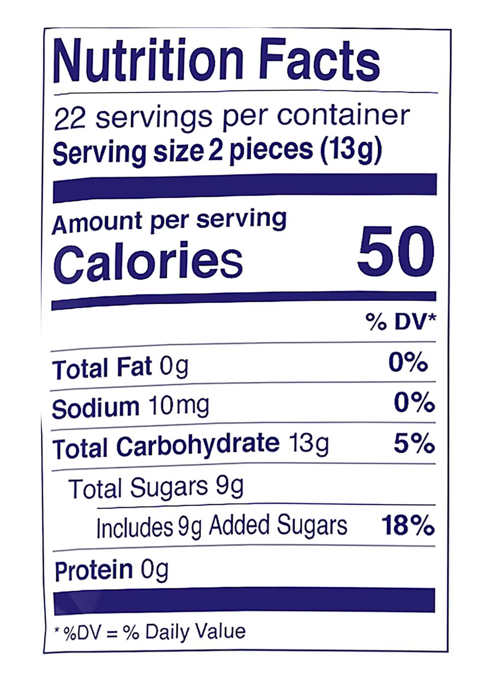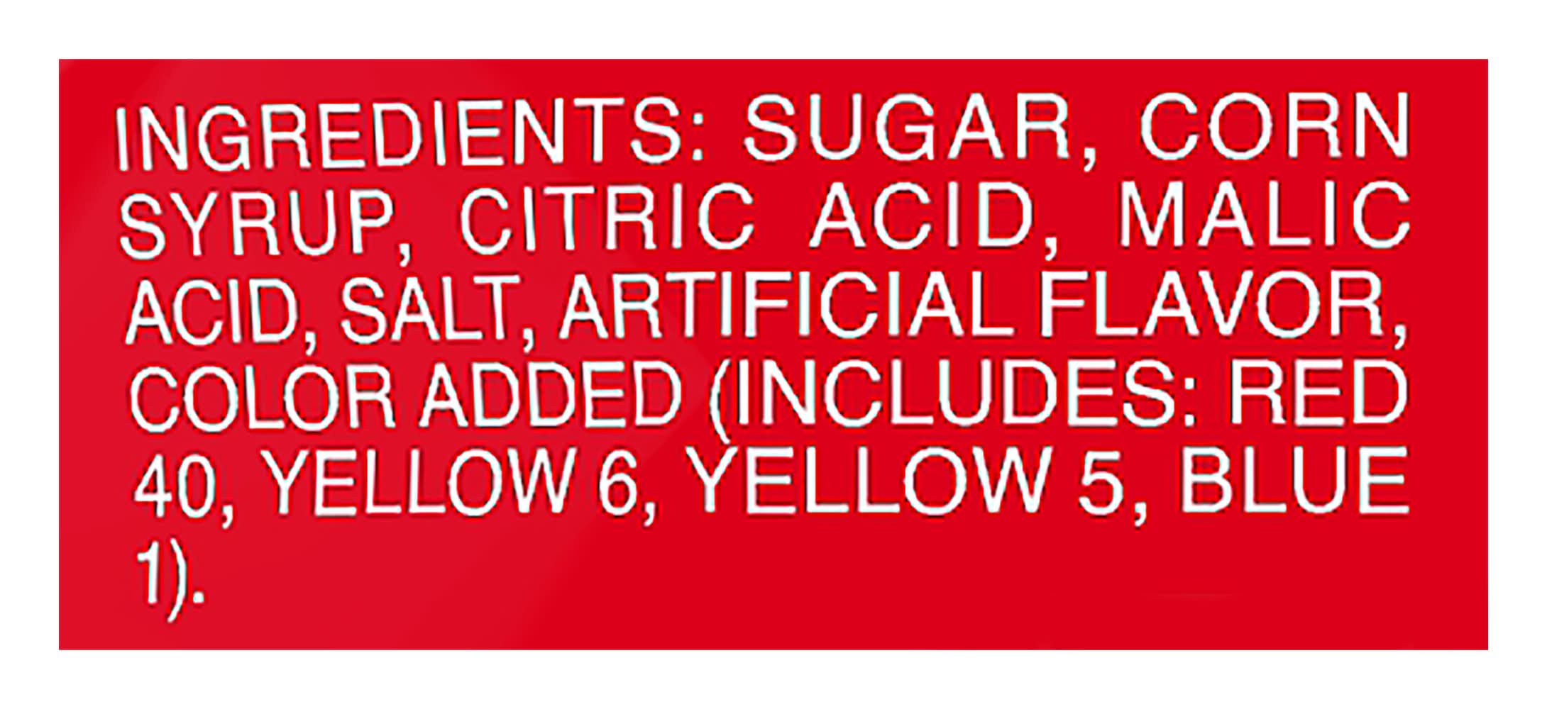 Ingredients: Sugar, Corn Syrup, Citric Acid, Malic Acid, Salt, Artificial Flavor, Color Added (Includes: Red 40, Yellow 6, Yellow 5, Blue 1)