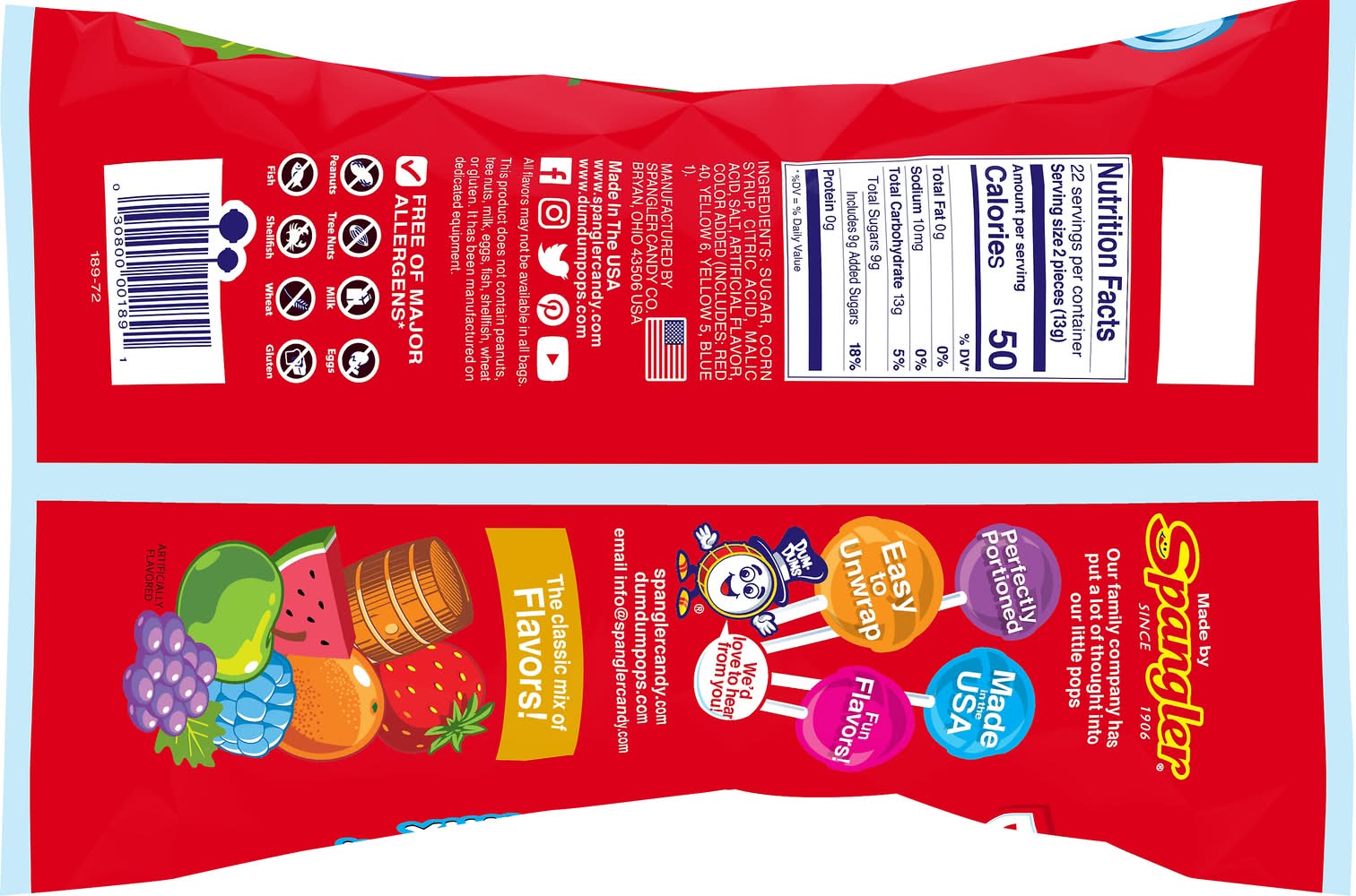 All flavors are no available in all bags. Made Spangler since 1906. Our family company has put a lot through into our little pops. Perfectly portions. Easy to unwrap. fun flavors! The classic mix of flavors! Spangler Candy, Bryan, OH, 43506