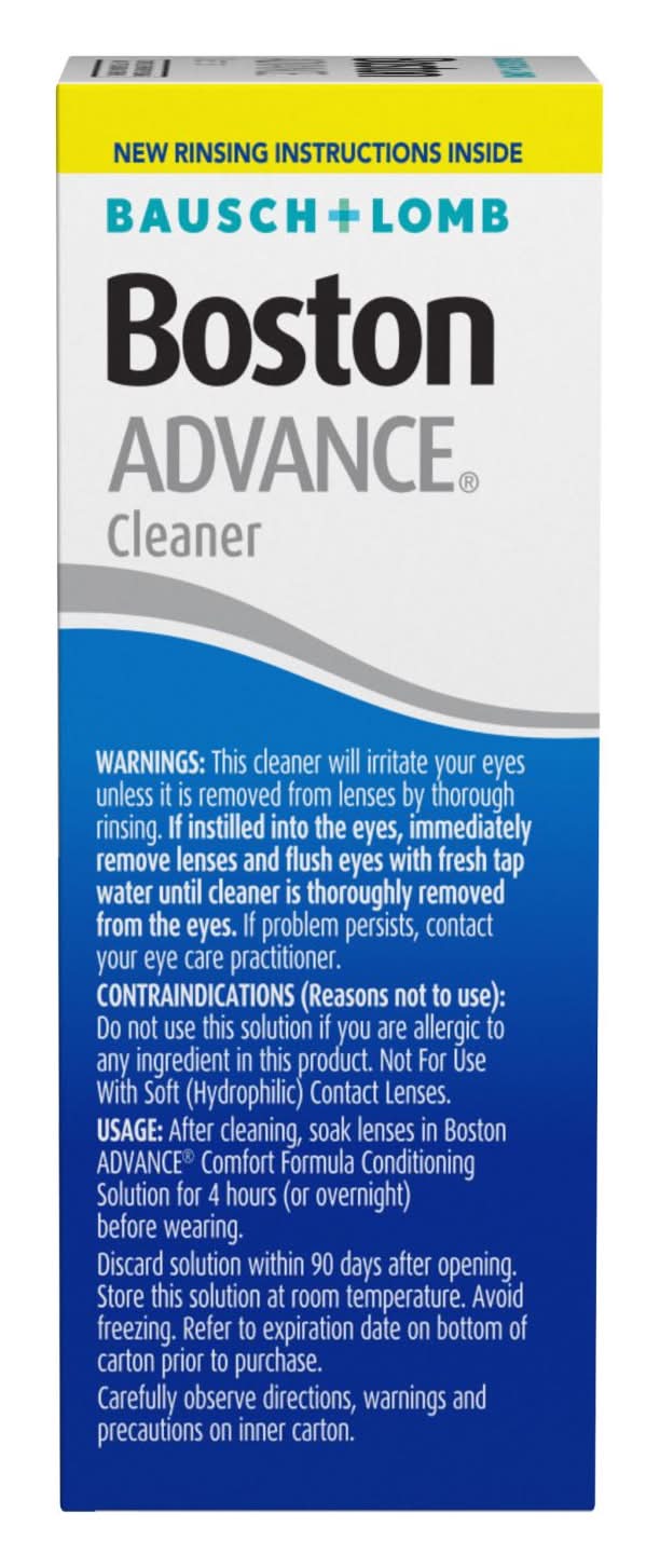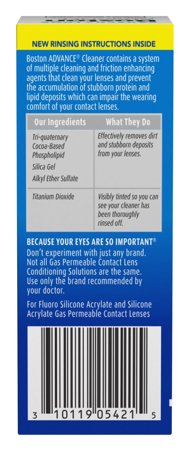 Bausch & Lomb Boston Advance Cleaner helps remove deposits from lenses. It's sterile and visibly tinted with Titanium Dioxide for improved rinsing. You can use it on rigid gas-permeable contact lenses. Boston Advance Cleaner heightens wearing comfort by removing lipids and proteins. It leaves your lenses clean, clear and ready for the disinfection step. Tri-quaternary Cocoa-Based Phospholipid, Silica Gel, and Alkyl Ether Sulfate effectively remove dirt and stubborn deposits from your lenses for clean, comfortable wear. Because your eyes are so important, don't experiment with just any brand. Not all gas-permeable contact lens solutions are the same. This item is FSA/HSA eligible. It helps remove deposits from rigid gas-permeable contact lenses. It is sterile and visibly tinted with Titanium Dioxide for improved rinsing. It heightens wearing comfort by removing lipids and proteins. It leaves your lenses clean, clear and ready for the disinfection step.