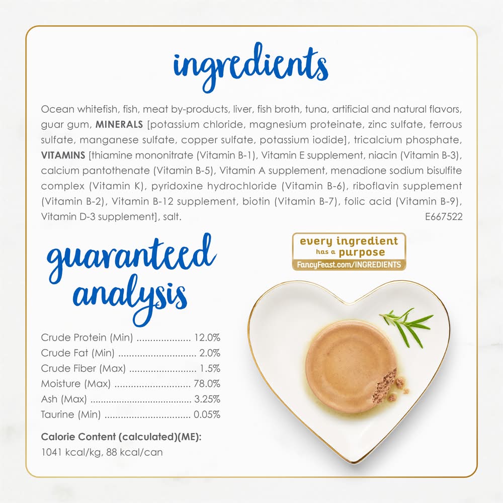 Ingredients: Ocean Whitefish, Fish, Meat By-Products, Liver, Fish Broth, Tuna, Artificial and Natural Flavors, Guar Gum, Minerals [Potassium Chloride, Magnesium Proteinate, Zinc Sulfate, Ferrous Sulfate, Manganese Sulfate, Copper Sulfate, Potassium Iodide], Tricalcium Phosphate, Vitamins [Thiamine Mononitrate (Vitamin B-1), Vitamin E Supplement, Niacin (Vitamin B-3), Calcium Pantothenate (Vitamin B-5), Vitamin A Supplement, Menadione Sodium Bisulfite Complex (Vitamin K), Pyridoxine Hydrochloride (Vitamin B-6), Riboflavin Supplement (Vitamin B-2), Vitamin B-12 Supplement, Biotin (Vitamin B-7), Folic Acid (Vitamin B-9), Vitamin D-3 Supplement], Salt. E667522 Contains: Fish, Fish, Tuna, Sulfites