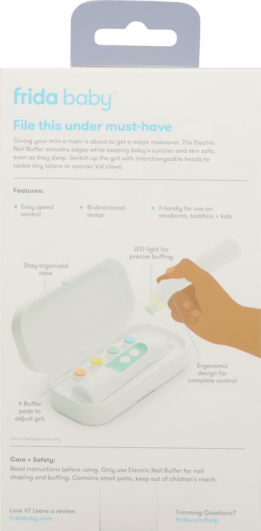 Scared of a snip slip? Nix your nail-care nerves and take total trimming control with the Electric Nail Buffer. It safely buffs and shapes tiny nails and cuticles, so you can keep up with your baby's non-stop nail growth. FRIDABABY EASY GRIP ELECTRIC NAIL TRIMMER Easily change speed and direction as you go, and switch the grit as needed with four interchangeable buffer pads for newborn nails to coarser toddler claws. An always-on LED task light eliminates shadows for more focus and precision, day or night. Once you've nailed their mani/pedi, store everything in the secure case with your go-to pad in place, so you can grab and buff with one hand when the next snag strikes. Lifetime Warranty