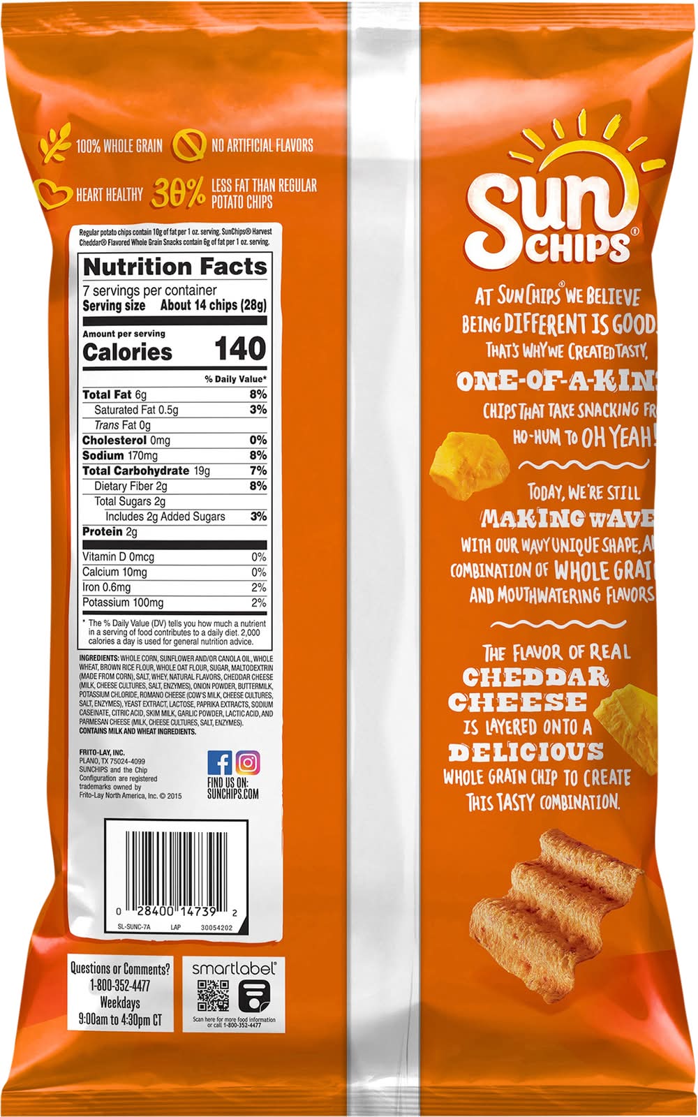 Sun Chips Harvest Cheddar snacks offer a unique combination of whole grain goodness in wavy, ripple shaped squares. Each bag contains multigrain snacks infused with a cheddar flavor that aims to satisfy your snack cravings. Flavor: Harvest cheddar