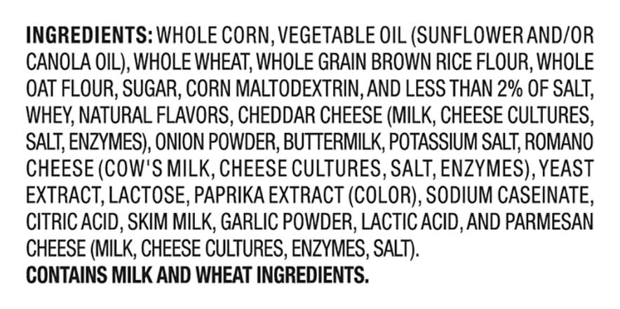 Ingredients: Whole Corn, Vegetable Oil (Sunflower and/or Canola Oil), Whole Wheat, Whole Grain Brown Rice Flour, Whole Oat Flour, Sugar, Corn Maltodextrin, and Less than 2% of Salt, Whey, Natural Flavors, Cheddar Cheese (Milk, Cheese Cultures, Salt, Enzymes), Onion Powder, Buttermilk, Potassium Salt, Romano Cheese (Cow's Milk, Cheese Cultures, Salt, Enzymes), Yeast Extract, Lactose, Paprika Extract (Color), Sodium Caseinate, Citric Acid, Skim Milk, Garlic Powder, Lactic Acid, and Parmesan Cheese (Milk, Cheese Cultures, Enzymes, Salt) Contains: Milk, Wheat, Lactose