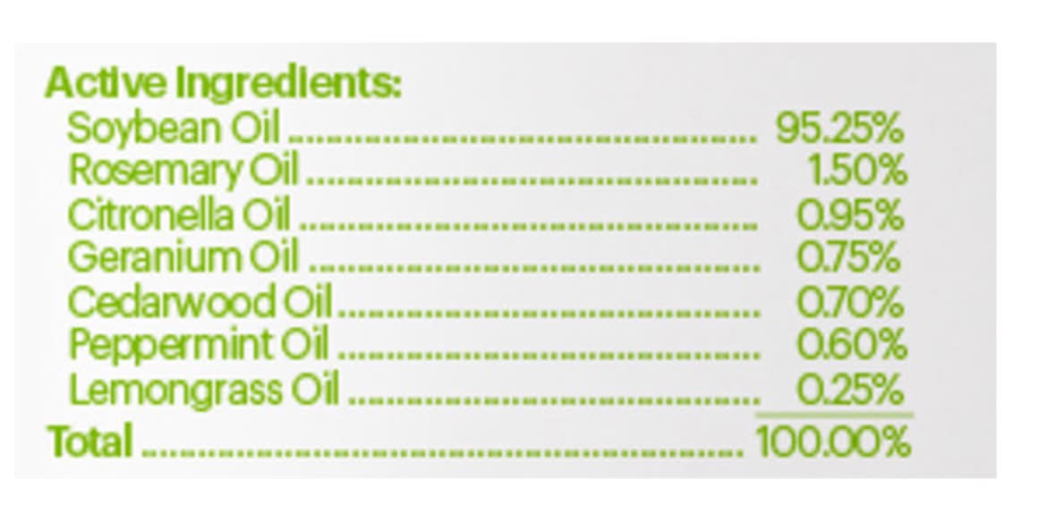 Ingredients: Active Ingredients: Soybean Oil (95.25%); Rosemary Oil (1.50%); Citronella Oil (0.95%); Geranium Oil (0.75%); Cedarwood Oil (0.70%); Peppermint Oil (0.60%); Lemongrass Oil (0.25%), Total 100.00%