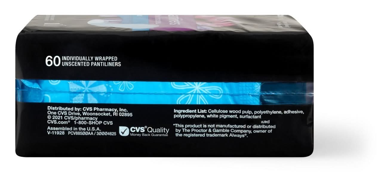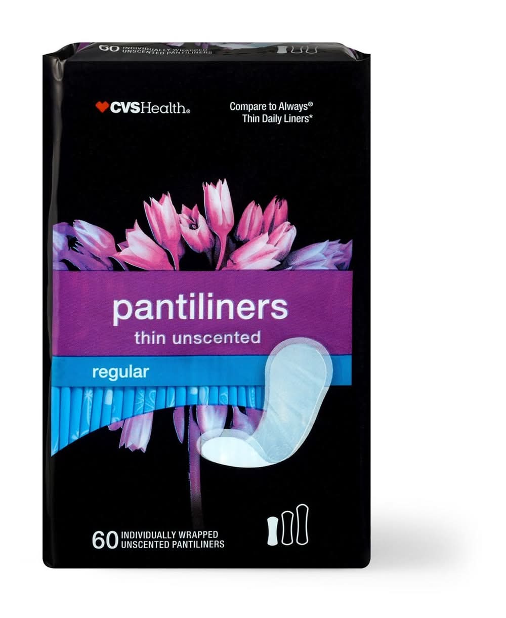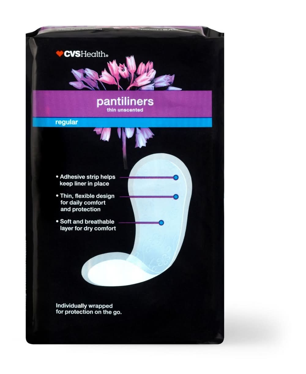 HSA/FSA Eligible Soft, cloth-like covering Incredibly thin, absorbent and comfortable Unscented For everyday protection Adhesive strip for a secure fit Individually wrapped, clean, discreet and practical Compare to Always Pantiliners Thin. Always is a registered trademark of The Procter & Gamble Company. You can approach each day feeling fresh, dry and confident with our incredibly thin CVS Health Unscented Pantiliners. Designed to be soft and comfortable, these liners are a great way to help you feel protected against the unexpected as part of your daily feminine hygiene routine. These unscented, thin pantiliners offer both comfort and absorbency so you can go about your day feeling clean and protected from life's little surprises. Designed to give you soft comfort, our pantiliners help make it easy to forget they're even there. A convenient adhesive strip helps hold the pantiliner securely in place in your panties as you move about. Individually wrapped, our thin pantiliners can give you convenient, discreet protection. Keep one in your purse or gym bag for those times when you may need one for complete peace of mind protection. Women deserve quality when it comes to the products they may need each month. We’ve reduced the price on CVS Health brand period products by 25%.* *FOR PERIOD PRODUCT PRICE REDUCTION: Qualifying period products include CVS Health and Live Better by CVS Health brand tampons, menstrual pads, liners and cups at core CVS Pharmacy locations and online. 25% reduction from regular retail price (does not reflect promotions or sales), effective dates on or before October 13, 2022