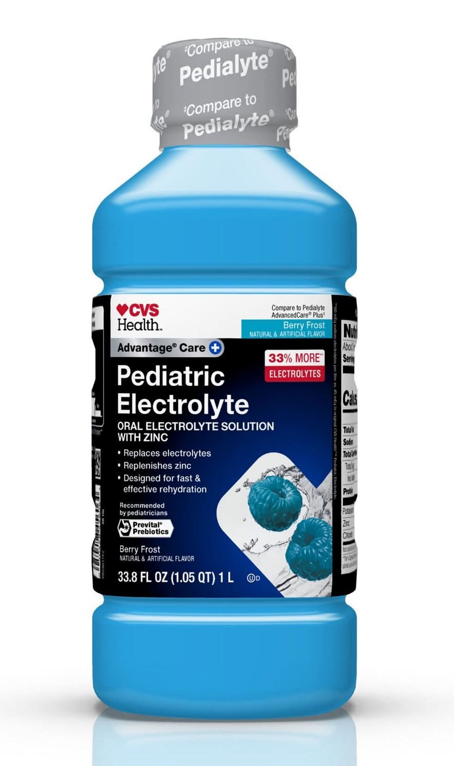 CVS Health Pediatric Electrolyte Oral Solution in Berry Frost flavor is formulated to help prevent dehydration by quickly restoring fluids and electrolytes more effectively than common beverages like sports drinks, sodas, juices, and water. It contains 33% more replenishing electrolytes compared to the original formulation, aiding in rapid rehydration. Additionally, it is infused with PreVital Prebiotics to support digestive health. This solution is suitable for both adults and children who may need advanced rehydration and electrolyte replacement due to intense exercise, heat exhaustion, travel, or illness-related dehydration. It is also used to replenish fluids and electrolytes lost to vomiting and diarrhea, ensuring electrolyte balance is maintained. Flavor: Berry frost
