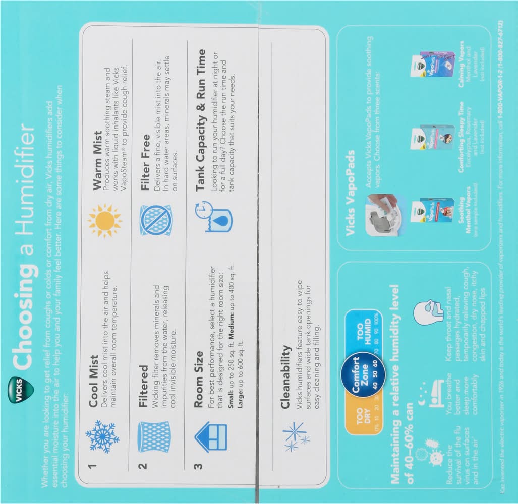Naturally helps relieve stuffy nose discomfort. For breathing and a more comfortable sleep. No filters required. Essential oil diffuser. Calming color changing night-light. Whisper quiet. Cool. Filter free. Up to 24 hrs of run time. Night-Light 7 soothing colors, night light optional. Whether you are looking to get relief from coughs or colds or comfort from dry air, Vicks humidifiers add essential moisture into the air to help you and your family feel better. Here are some things to consider when choosing your humidifier: 1 Cool Mist: Delivers cool mist into the air and helps maintain overall room temperature. Warm Mist: Produces warm soothing steam and works with liquid inhalants like Vicks Vapo Steam to provide cough relief. 2 Filtered: Wicking filter removes minerals and impurities from the water, releasing cool invisible moisture. Filter Free: Delivers a fine, visible mist into the air. In hard water areas, minerals may settle on surfaces. Size: S