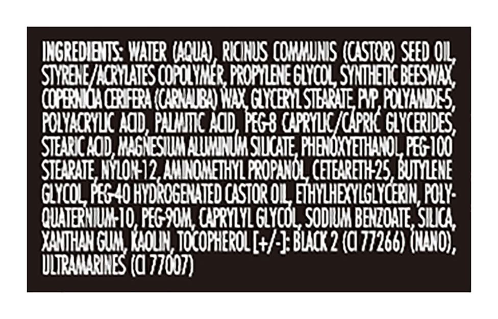 Ingredients: Water (Aqua), Ricinus Communis (Castor) Seed Oil, Styrene/Acrylates Copolymer, Propylene Glycol, Synthetic Beeswax, Copernicia Cerifera (Carnauba) Wax, Glyceryl Stearate, PVP, Polyamide-5, Polyacrylic Acid, Palmitic Acid, PEG-8 Caprylic/Capric Glycerides, Stearic Acid, Magnesium Aluminum Silicate, Phenoxyethanol, PEG-100 Stearate, Nylon-12, Aminomethyl Propanol, Ceteareth-25, Butylene Glycol, PEG-40 Hydrogenated Castor Oil, Ethylhexylglycerin, Polyquaternium-10, PEG-90M, Caprylyl Glycol, Sodium Benzoate, Silica, Xanthan Gum, Kaolin, Tocopherol [+/-]: Black 2 (CI 77266) (Nano), Ultramarines (CI 77007)