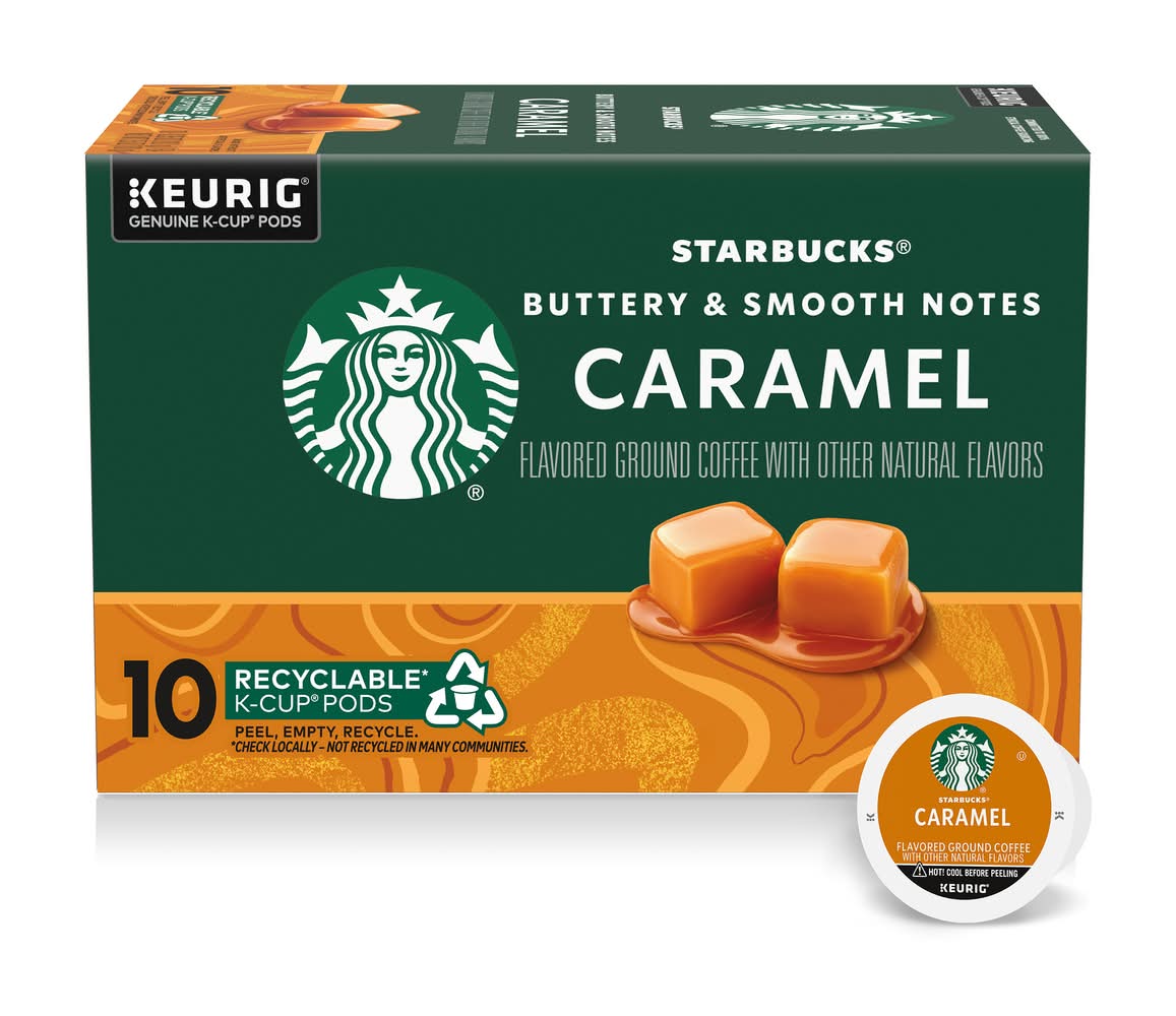 Flavored with other natural flavor smooth & buttery keurig brewed® 10 k-cup® - for use in all keurig® k-cup® brewers tasting notes - smooth & buttery aromatic and light-bodied with a blend of rich caramel. Always 100% arabica coffee. Keurig brewed® is our promise. Since the beginning, we've been dedicated to the art and science of bringing you the coffee you love, every time. Much like a pastry chef who experiments with recipes to get a dessert just right, our coffe experts went round after round to find the best natural ingredients to craft this caramel-flavored coffee. The medium roast beans balanced with luscious caramel flavor create a treat you can savor and share. Serving suggestion bring out even more flavor by adding milk and sugar. We recommend brewing on the 8 fl oz setting. Always look for the keurig brewed® seal. The only mark of genuine keurig quality. Packed in k-cup® packs for keurig® k-cup® brewing systems not for keurig® vue® brewing systems ©2014 starbucks coffee company. All rights reserved. Tasting notes describe it as aromatic, light-bodied, and featuring a blend of rich caramel Made with 100% arabica coffee, guaranteeing Keurig Brewed® quality Coffee experts carefully selected natural ingredients to create the perfect caramel-flavored coffee, akin to a pastry chef perfecting a dessert recipe Medium roast beans combined with luscious caramel flavor provide a delicious treat to enjoy and share • Flavor: Caramel • Starbucks Coffee Company, 2401 Utah Avenue South, Seattle, WA, 98134 • Packaging: Reusable