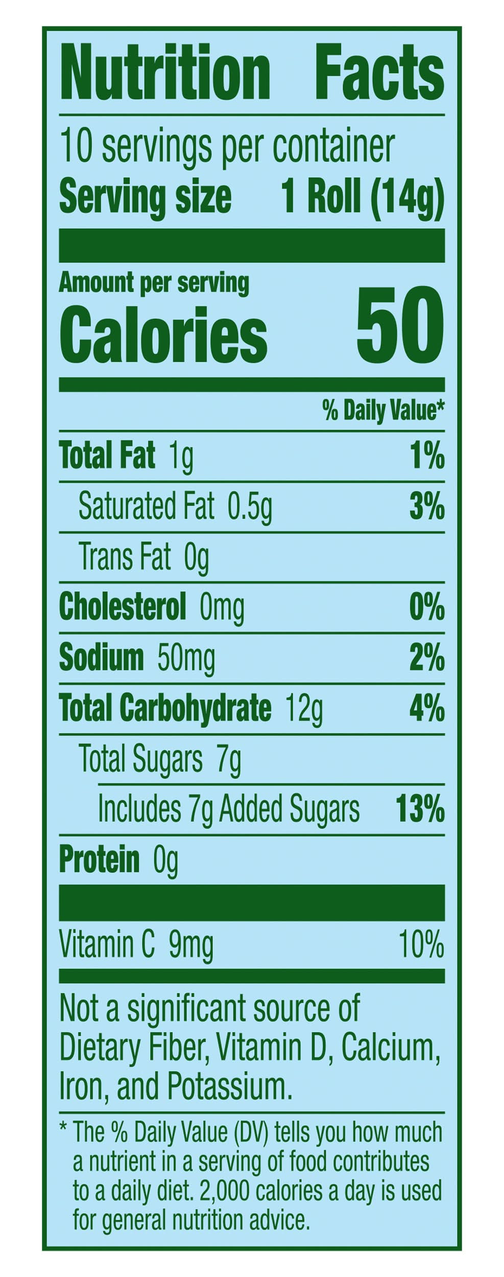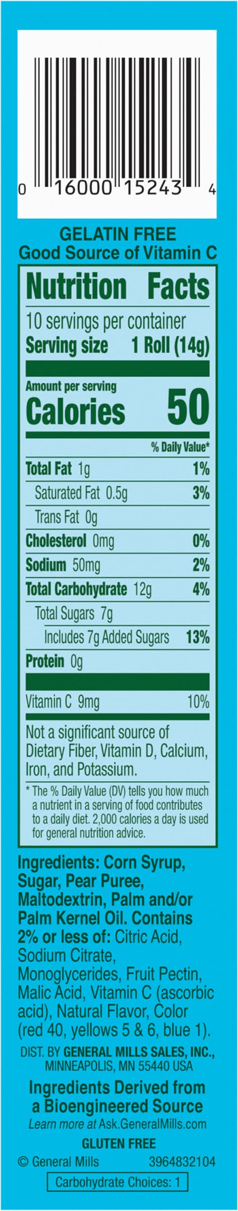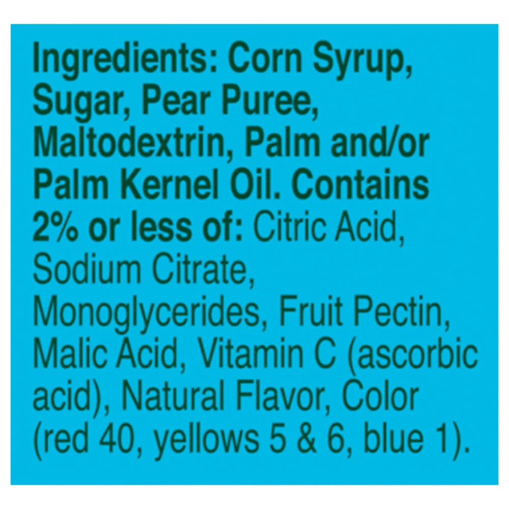 Ingredients: Watermelon: Corn Syrup, Sugar, Pear Puree, Maltodextrin, Palm and/or Palm Kernel Oil, Contains 2% or Less of: Citric Acid, Sodium Citrate, Monoglycerides, Fruit Pectin, Malic Acid, Vitamin C (Ascorbic Acid), Natural Flavor, Color (Red 40, Yellows 5 & 6, Blue 1). Green Apple: Corn Syrup, Sugar, Pear Puree, Maltodextrin, Palm and/or Palm Kernel Oil, Contains 2% or Less of: Citric Acid, Sodium Citrate, Monoglycerides, Fruit Pectin, Malic Acid, Vitamin C (Ascorbic Acid), Natural Flavor, Color (Red 40, Yellows 5 & 6, Blue 1). Contains: Corn Additives: Genetically Modified Ingredients