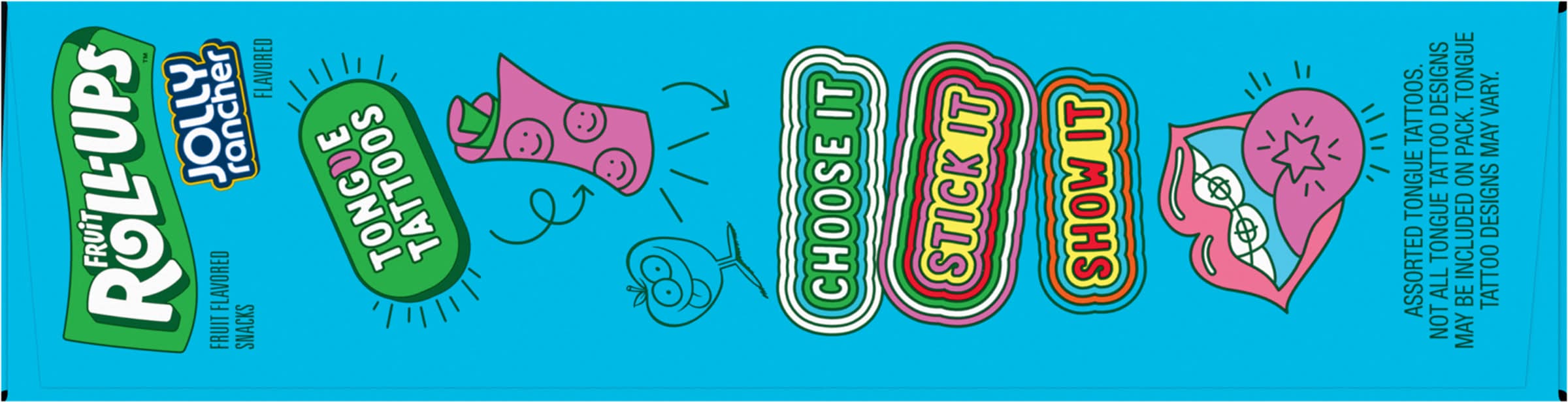 Watermelon: Flavored with other natural flavors. Green Apple: Flavored with other natural flavors. Gluten free. Good source of Vitamin C. Ingredients derived from a bioengineered source. Tongue tattoos. Choose it. Stick it. Show it. Assorted tongue tattoos. Not all tongue tattoo designs may be included on pack. Tongue tattoo designs may vary. Gelatin free. • Flavor: Jolly rancher • Pack size: 10