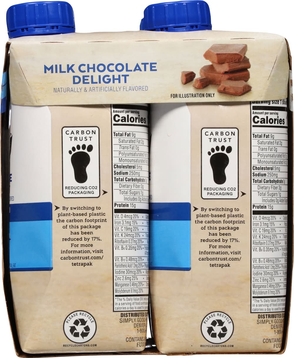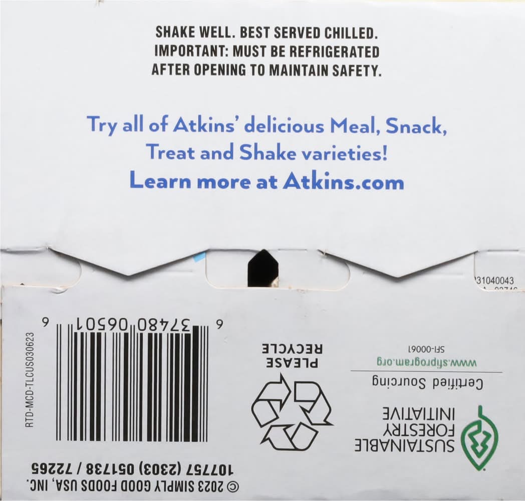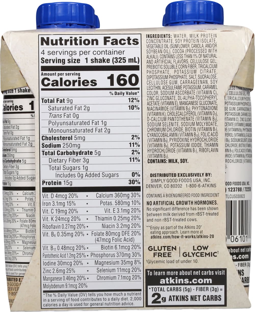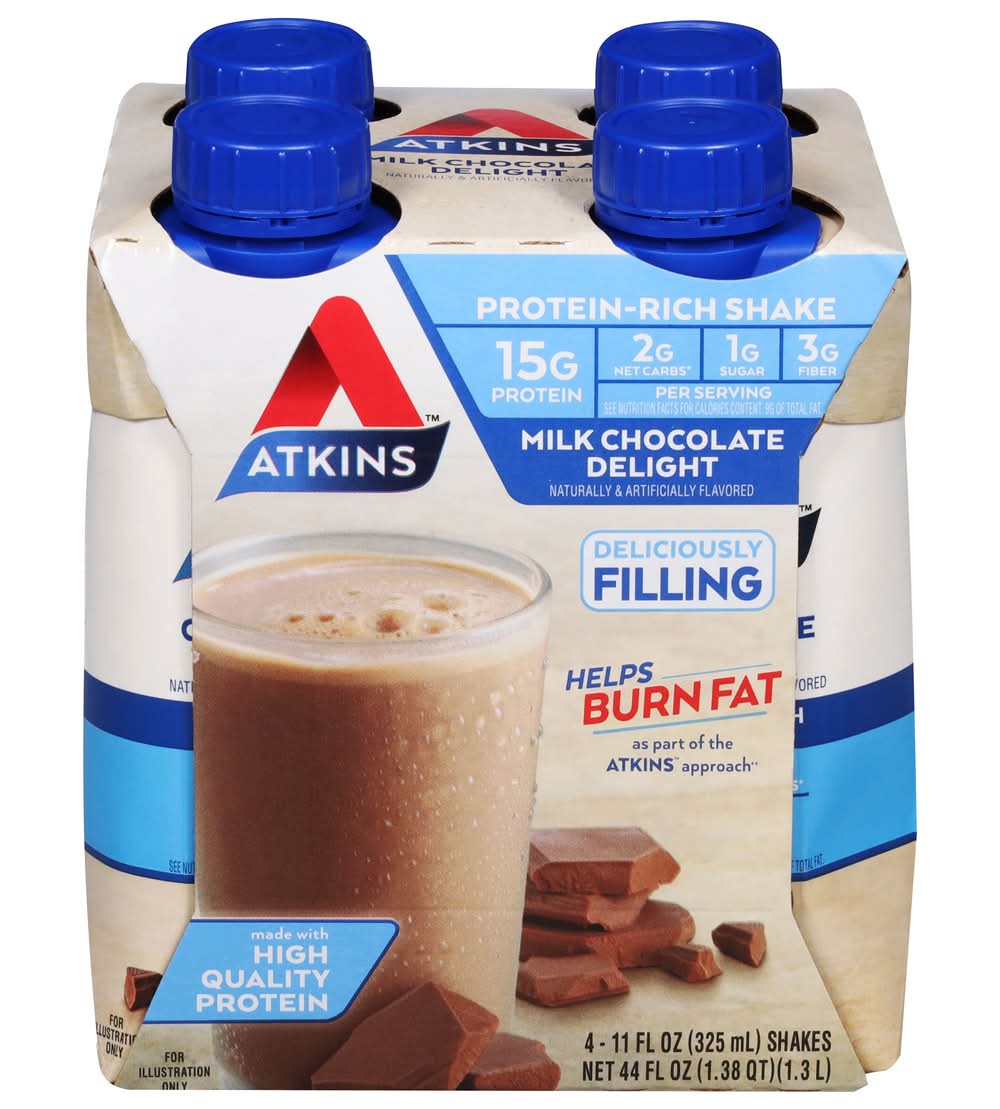 Our ready-to-drink shakes provide steady energy when you need it. For a quick, delicious breakfast or a mid-day recharge, reach for this rich and creamy shake to satisfy hunger. Our shakes are perfectly formulated to keep you satisfied and energized for the busy day ahead! Our gluten free Milk Chocolate Delight Protein-Rich Shake provides 5 grams of fiber and 15 grams of high-quality protein per serving to satisfy your hunger while helping you achieve your daily protein intake goals. And, with 2 grams of net carbs and 1 gram of sugar per serving, this shake is perfect for a keto friendly*, low carb lifestyle. *When used with Atkins ketogenic programs Pack of 4 Atkins Protein Shakes in Milk Chocolate Delight flavor Convenient and ready-to-drink shakes Rich and creamy with a satisfying milk chocolate flavor Contains 15 grams of protein per serving Only 2 grams of net carbs Suitable for those following the Atkins approach Ideal as a quick snack or post-workout recovery drink Enjoy a delicious and protein-packed shake with the Atkins Protein Shake in Milk Chocolate Delight • Flavor: Milk chocolate delight • Pack size: 4 • Atkins Nutritionals, Inc., Denver, CO, 80202, 800-6-ATKINS, atkins.com • Packaging: Reusable
