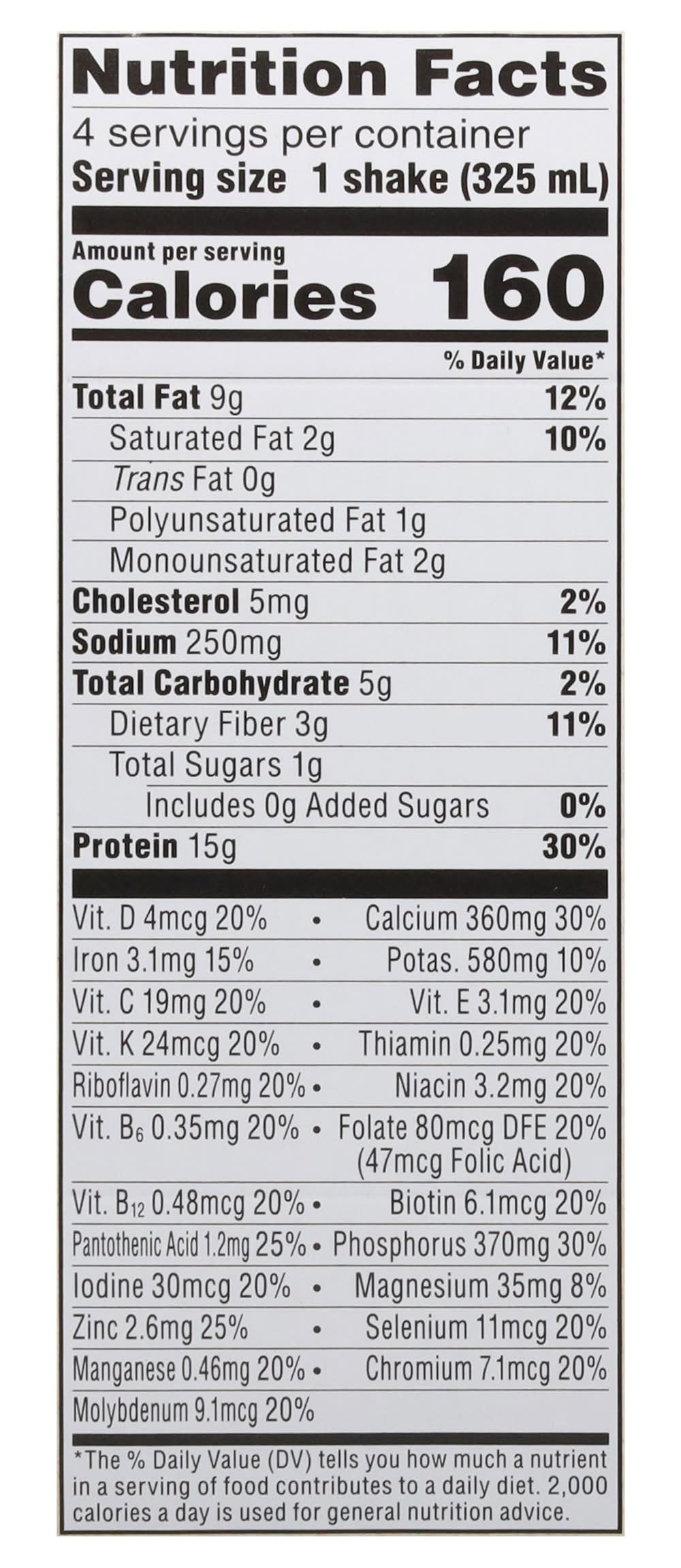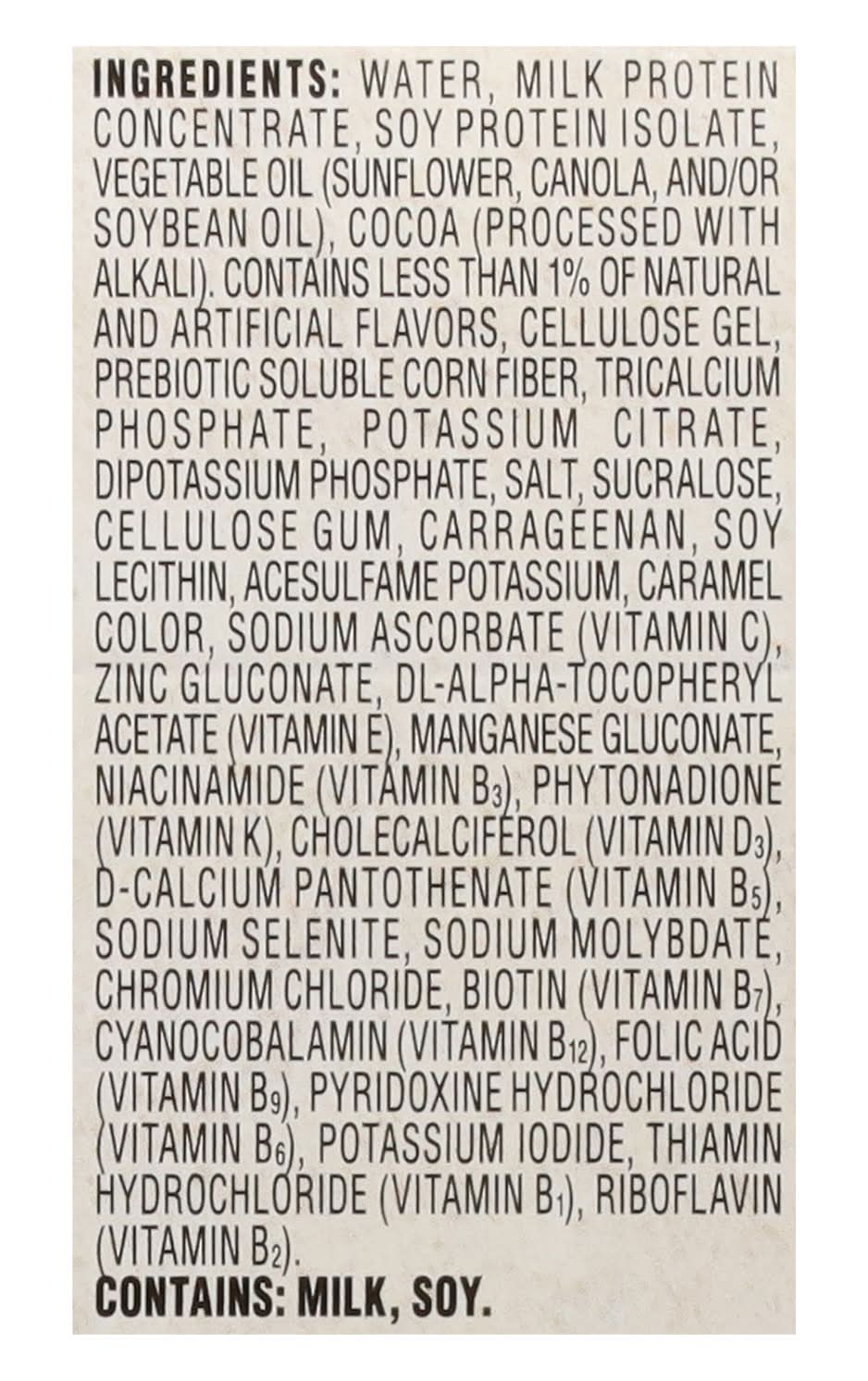 Ingredients: Water, Milk Protein Concentrate, Soy Protein Isolate, Vegetable Oil (Sunflower, Canola, and/or Soybean Oil), Cocoa (Processed with Alkali), Contains Less than 1% of Natural and Artificial Flavors, Cellulose Gel, Prebiotic Soluble Corn Fiber, Tricalcium Phosphate, Potassium Citrate, Dipotassium Phosphate, Salt, Sucralose, Cellulose Gum, Carrageenan, Soy Lecithin, Acesulfame Potassium, Caramel Color, Sodium Ascorbate (Vitamin C), Zinc Gluconate, DL-Alpha-Tocopheryl Acetate (Vitamin E), Manganese Gluconate, Niacinamide (Vitamin B3), Phytonadione (Vitamin K), Cholecalciferol (Vitamin D3), D-Calcium Pantothenate (Vitamin B5), Sodium Selenite, Sodium Molybdate, Chromium Chloride, Biotin (Vitamin B7), Cyanocobalamin (Vitamin B12), Folic Acid (Vitamin B9), Pyridoxine Hydrochloride (Vitamin B6), Potassium Iodide, Thiamin Hydrochloride (Vitamin B1), Riboflavin (Vitamin B2) Contains: Milk, Soybeans, Corn