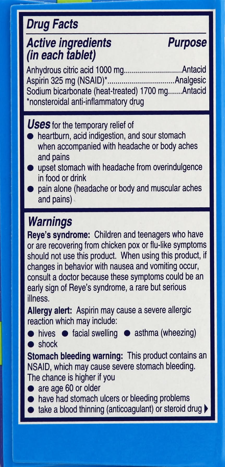 Ingredients: Active Ingredients: In Each Tablet: Anhydrous Citric Acid (1000 mg), Aspirin (325 mg) (NSAID), Sodium Bicarbonate (Heat-Treated) (1700 mg). Purpose: Antacid, Analgesic, Nonsteroidal Anti-Inflammatory Drug; Antacid. Inactive Ingredients: Aspartame, Docusate Sodium, Flavor, Povidone, Sodium Benzoate Additives: Inactive Ingredients: Aspartame Docusate Sodium Flavor Povidone Sodium Benzoate.