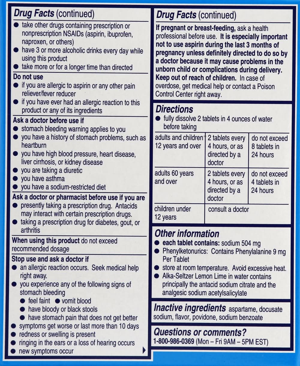 Directions: fully dissolve 2 tablets in 4 ounces of water before taking. place two (2) tablets in 4 oz of water. dissolve tablets completely. you do not have to drink any of the residue that may be on the bottom of the glass. the medicines of alka-seltzer are in the water. adults and children 12 years and over: 2 tablets every 4 hours, or as directed by a doctor. do not exceed 8 tablets in 24 hours. adult 60 years and over: 2 tablets every 4 hours, or as directed by a doctor. do not exceed 4 tablets in 24 hours. children under 12 years: consult a doctor.