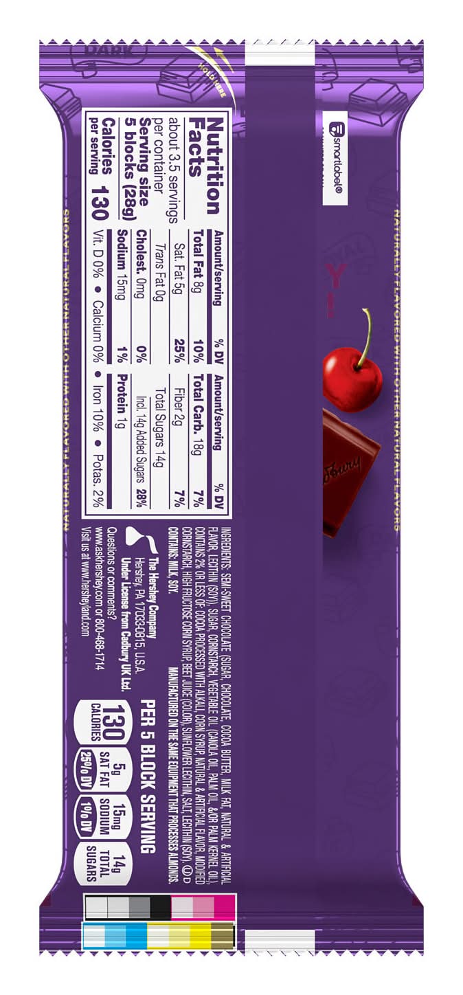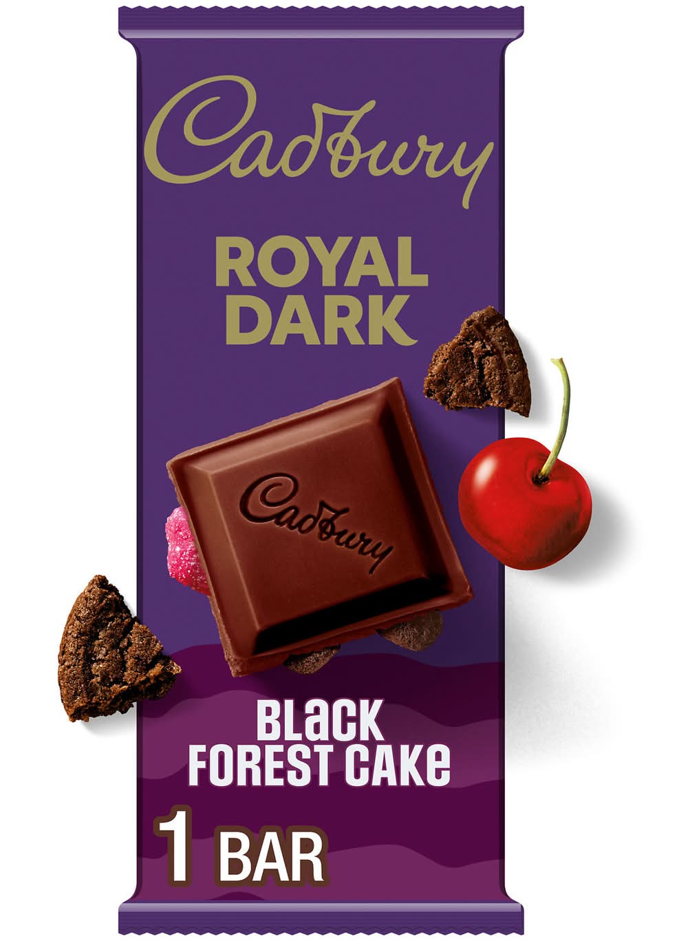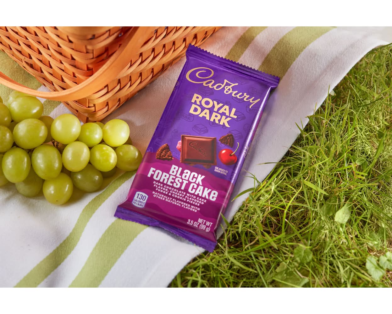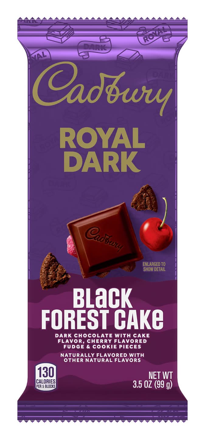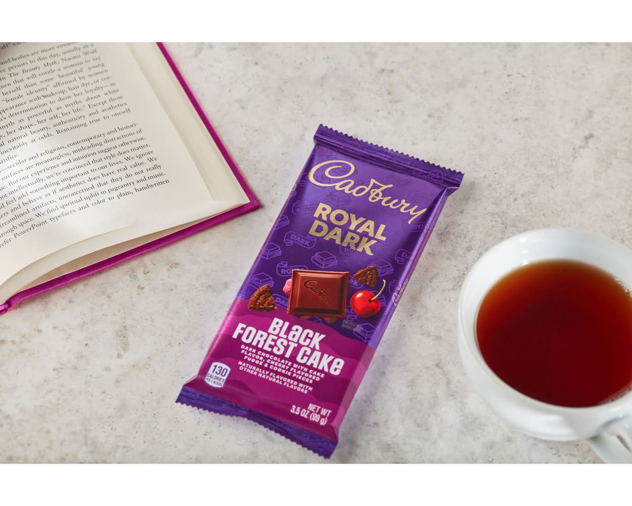 Reach for a rich, invigorating CADBURY ROYAL DARK black forest cake flavored chocolate bar when you want to indulge in a decadent, velvety smooth dark chocolate treat with cake flavor, cherry flavored fudge and crunchy cookie pieces. Enjoy a few bites straight out of the wrapper whenever you need a break. With this dark chocolate, you can even add a special touch to your baking prep! Carefully melt the CADBURY chocolate, then drizzle and swirl it over sweet and salty snacks, including pretzels, fruit, marshmallows and assorted nuts. Take a CADBURY ROYAL DARK black forest flavored chocolate bar to work for a midday treat with your co-workers, or add some bars to gift baskets to share the timeless flavor of black forest cake and the extra crunch of cookie pieces. These candies also make unique chocolate gifts during Valentine's Day, basket fillers at Easter, stocking stuffers throughout the holiday season and Halloween treats during trick-or-treating. Get ready to please the crowd whether you're celebrating a holiday or just enjoying an ordinary sharing moment. CADBURY ROYAL DARK black forest cake flavored chocolate candy has a variety of flavors in every bite. Just don't forget to save a few pieces for yourself during all of that sharing! Packaging: Reusable
