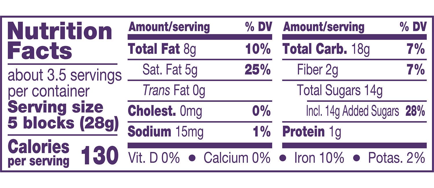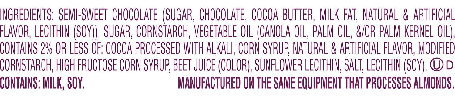 Ingredients: SEMI-SWEET CHOCOLATE, SUGAR, CHOCOLATE, COCOA BUTTER, MILK FAT, NATURAL ARTIFICIAL FLAVOR, LECITHIN (SOY), SUGAR, CORNSTARCH, VEGETABLE OIL (CANOLA OIL, PALM OIL, /OR PALM KERNEL OIL), CONTAINS 2% OR LESS OF: COCOA PROCESSED WITH ALKALI, CORN SYRUP, NATURAL ARTIFICIAL FLAVOR, MODIFIED CORNSTARCH, HIGH FRUCTOSE CORN SYRUP, BEET JUICE (COLOR), SUNFLOWER LECITHIN, SALT, LECITHIN (SOY), . Contains: Contains: Soy|Milk