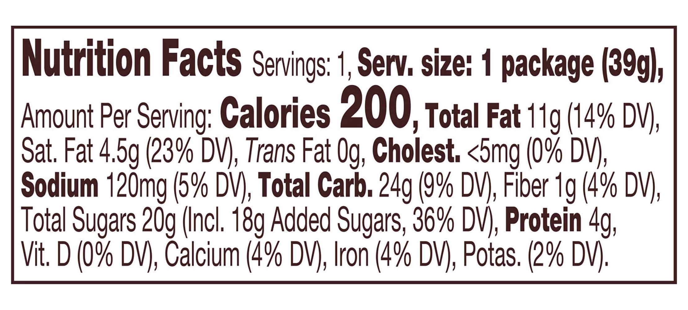 Ingredients: Milk Chocolate (Sugar, Cocoa Butter, Chocolate, Skim Milk, Milk Fat, Lactose, Lecithin (Soy), PGPR), Peanuts, Sugar, Vegetable Oil (Palm Oil, Shea Oil, Sunflower Oil, Palm Kernel Oil, Soybean Oil, Canola Oil, &/or Safflower Oil), Dextrose, Skim Milk, Corn Syrup Solids, Lactose (Milk), Contains 2% or Less of: Salt, Tapioca Starch, White Rice Flour, Lecithin (Soy), Artificial Flavor, Baking Soda, Chocolate, Cocoa Processed with Alkali, Cornstarch, Invert Sugar, Oat Flour, Xanthan Gum, PGPR, TBHQ & Citric Acid (to Maintain Freshness) Contains: Milk, Lactose, Soybeans, Peanuts, Oat