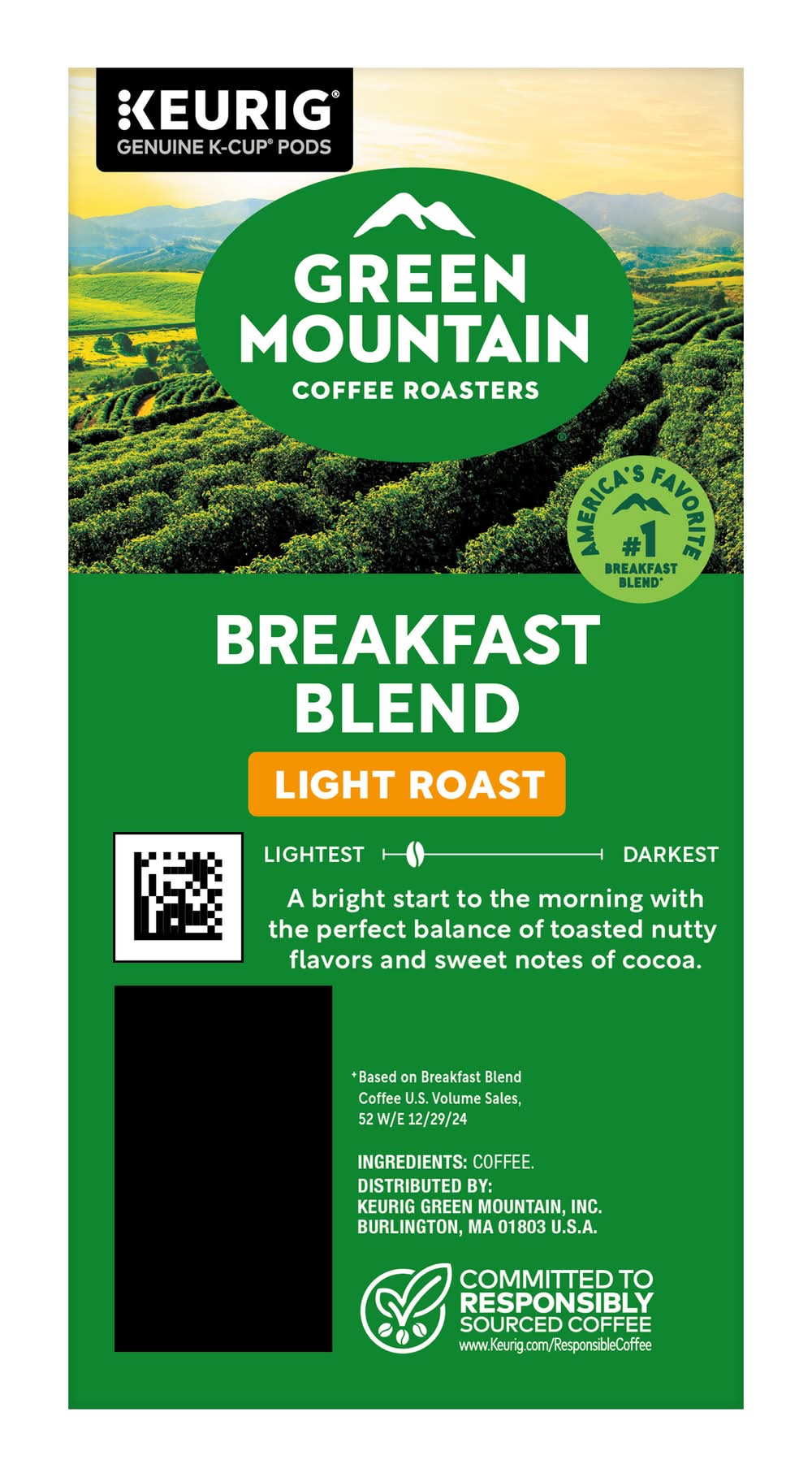 The mountains are a special place. It's where Green Mountain Coffee Roasters was born. It's where we developed our adventurous spirit and commitment to improving the lands through sustainably sourced coffee. We're driven to bring the world a richer, better cup of coffee. Be bold. Be alive. Grab a cup and get out there. The Green Mountain Coffee Roasters Breakfast Blend is as eye-opening and delightful as the dawn itself. Clean and bright, with balanced sweetness, nutty flavor, and a silky mouthfeel. Made with 100% Arabica coffee. These single-serve K-Cup pods are compatible with all Keurig K-Cup Pod Single-Serve Coffee Makers. Each K-Cup pod is filled with the freshest ground coffee and brews a perfect, great tasting cup of coffee, every time. Certified Orthodox Union Kosher. What does being 100% responsibly sourced coffee mean? Responsibly Sourced means the coffee we purchase is grown and sold in adherence to a credible sourcing program that aligns with our company Responsible Sourcing Guidelines. Our coffee is 100% responsibly sourced. Introducing Recyclable* K-Cup Pods: Simple. Delicious. And now Recyclable. Enjoy the same great-tasting coffee you know and love, and when you're done just peel, empty and recycle. Bringing the world a richer, better cup of coffee Green Mountain Coffee Roasters Breakfast Blend: Eye-opening and delightful Clean, bright, balanced sweetness, nutty flavor, silky mouthfeel Made with 100% Arabica coffee Compatible with all Keurig K-Cup Pod Single-Serve Coffee Makers Freshest ground coffee in each K-Cup pod Certified Orthodox Union Kosher 100% responsibly sourced coffee • Keurig Green Mountain, Waterbury, VT, 05676-1529 • Packaging: Reusable