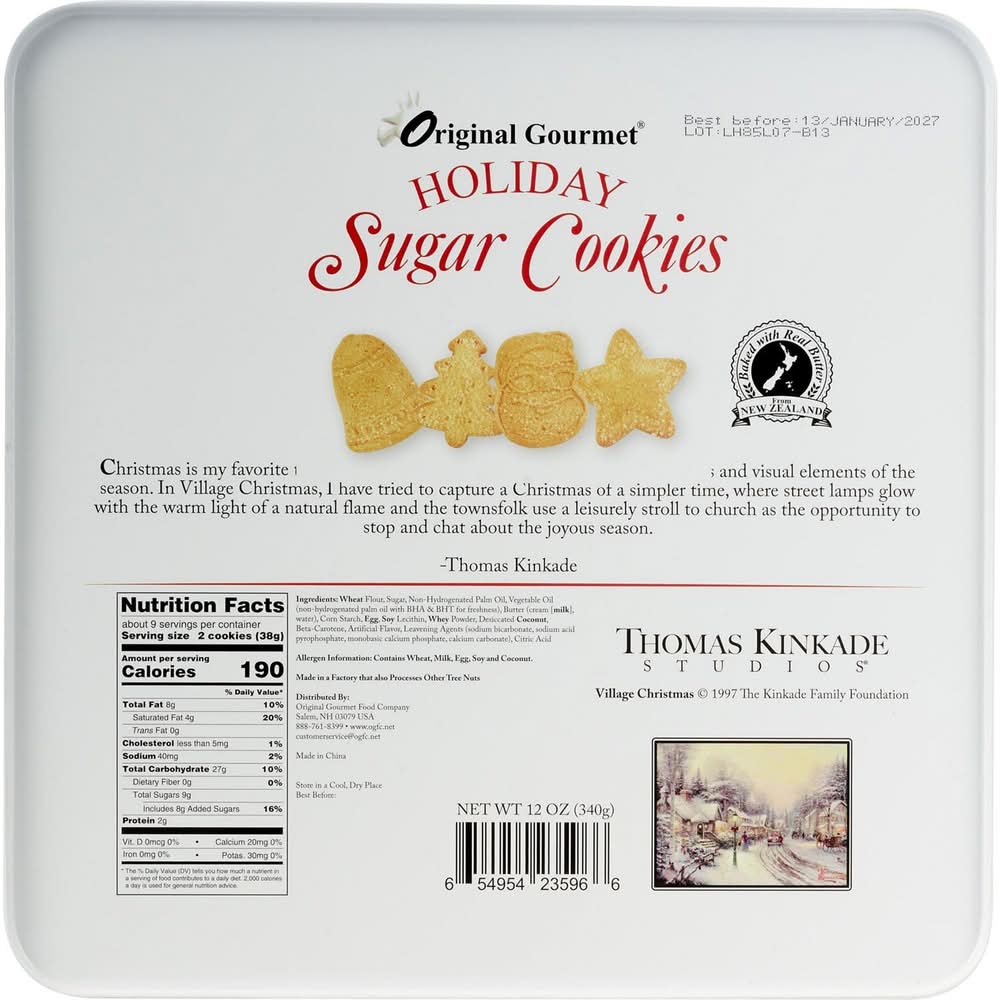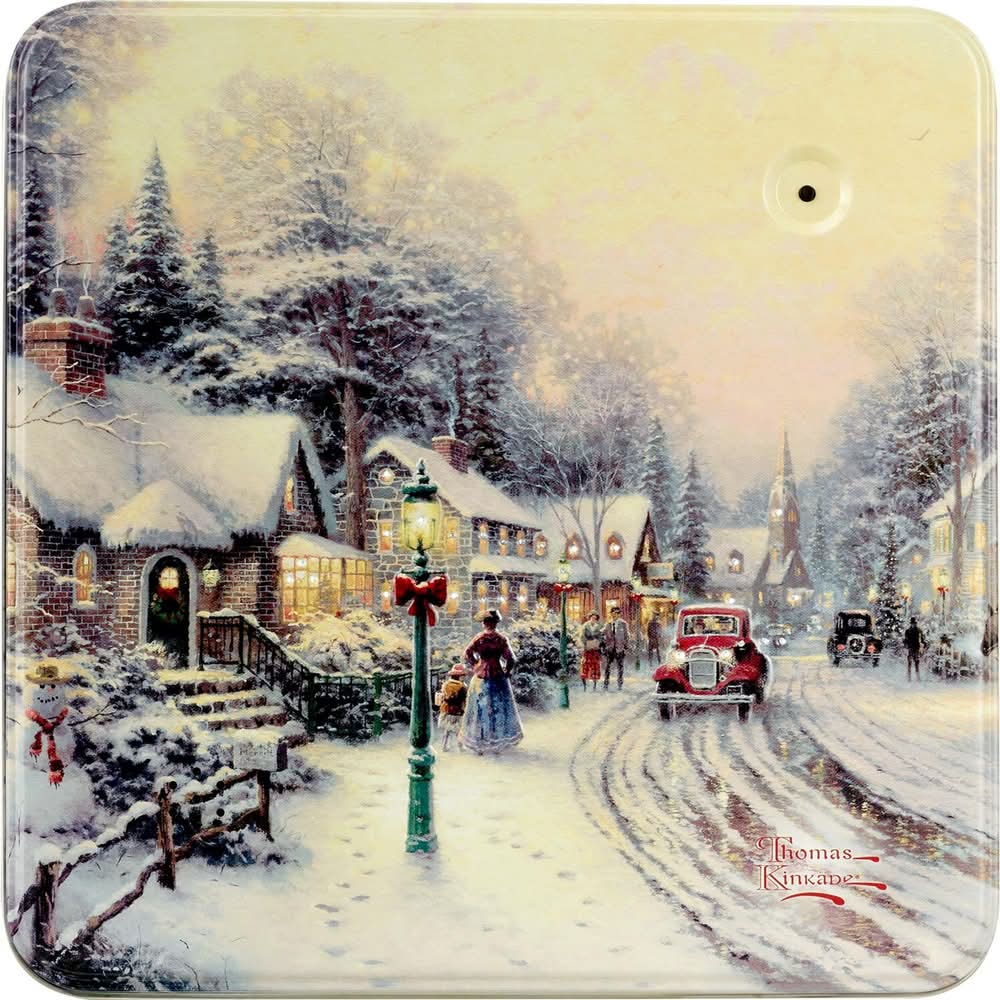 Experience the charm of a Thomas Kinkade Music & Light Sugar Cookie Tin designed for a refined taste. Each tin contains sugar cookies known for their sweet flavor. The collectible, square-shaped tin is not only durable but also adorned with artwork, enhancing its aesthetic appeal. This product combines visual and culinary delights, offering a delightful experience with each opening.
