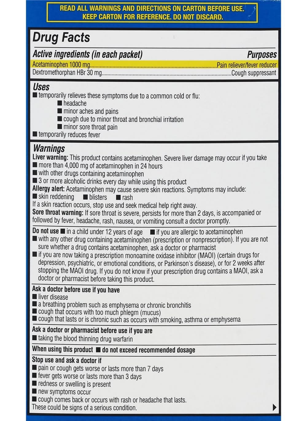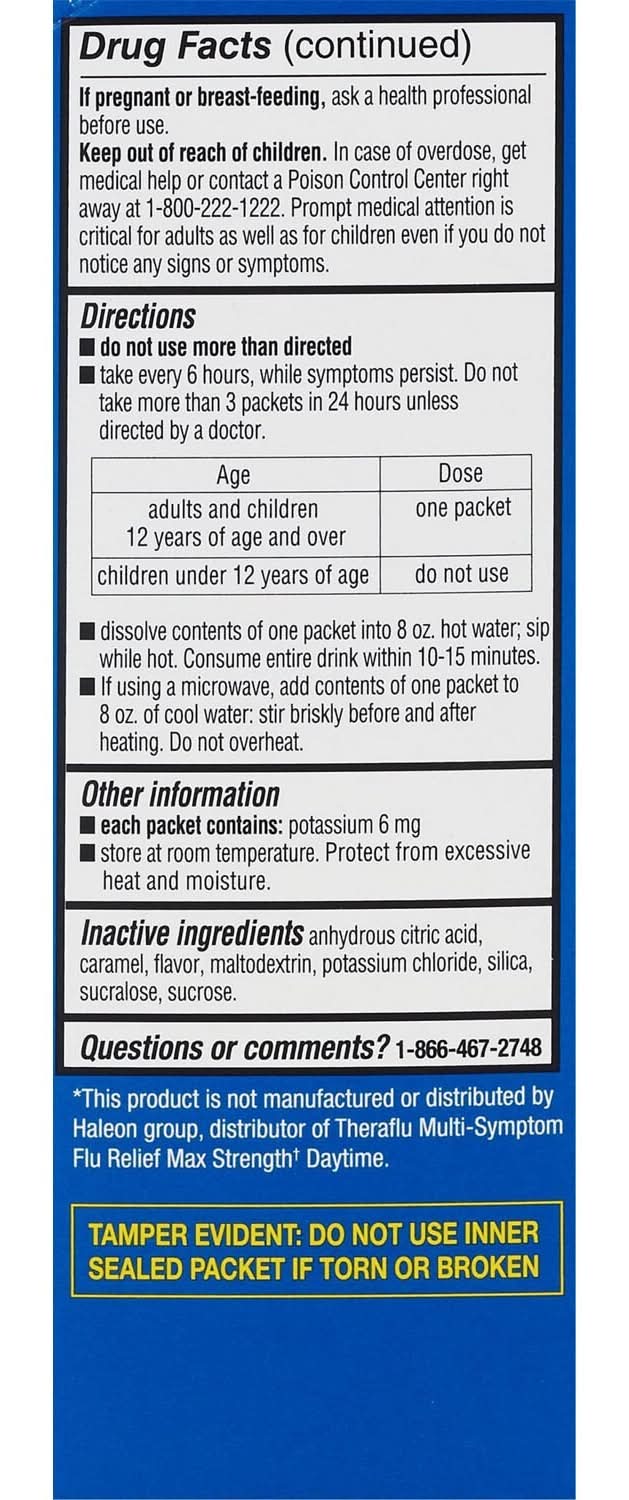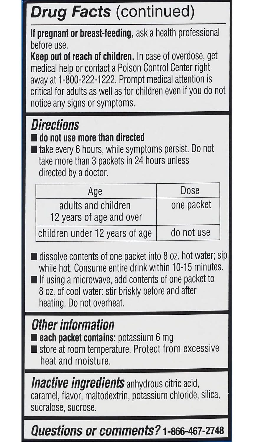 Hot liquid therapy that relieves DAYTIME fever, body ache, headache, sore throat pain, and cough FSA/HSA Eligible Easy to use powder packet, just add to hot water Soothing to the throat **Due to state restrictions, items unshippable to CA,NY,LA,AZ,VA,KY,WA,TN,NJ,FL,DE,AK,NV,OR,CO,PA, WI, WV, TX, OH or MI Flavor: Honey lemon