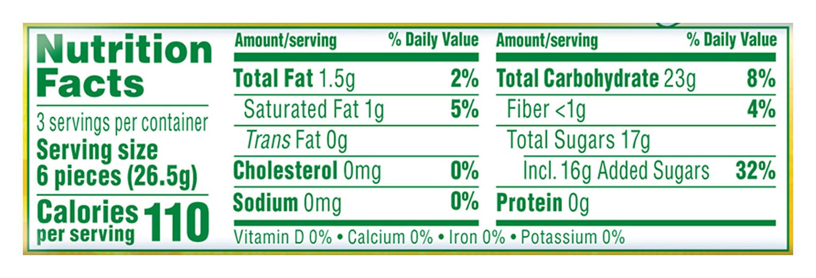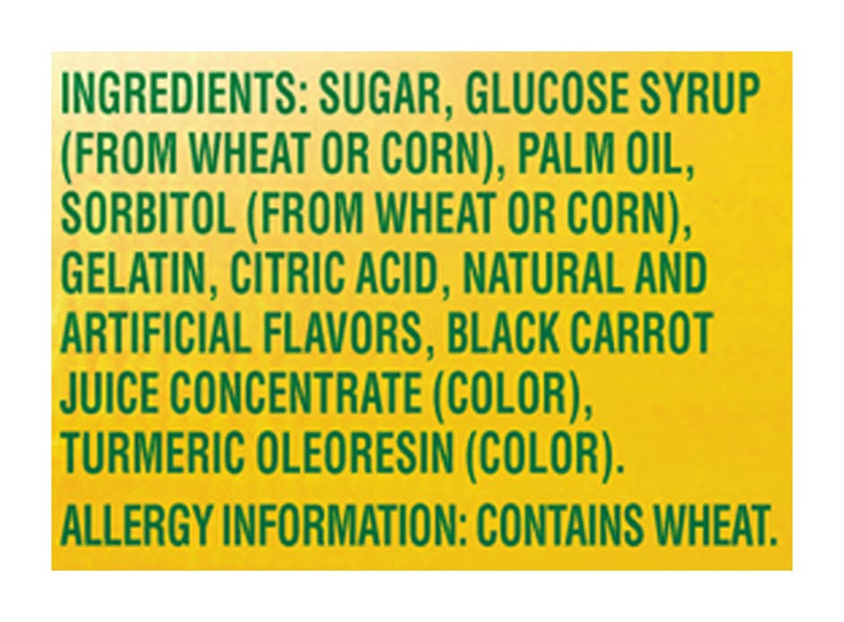 Ingredients: Sugar, Glucose Syrup (from Wheat or Corn), Palm Oil, Sorbitol (from Wheat or Corn), Gelatin, Citric Acid, Natural and Artificial Flavors, Black Carrot Juice Concentrate (Color), Turmeric Oleoresin (Color) Contains: Wheat