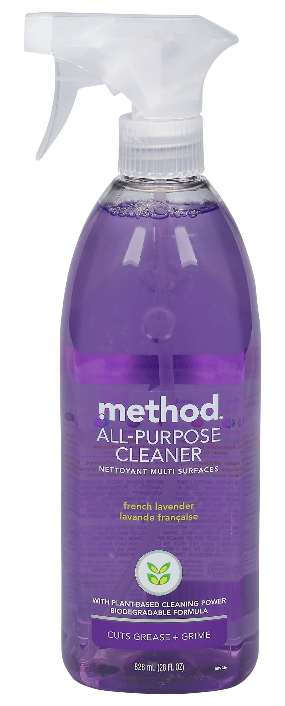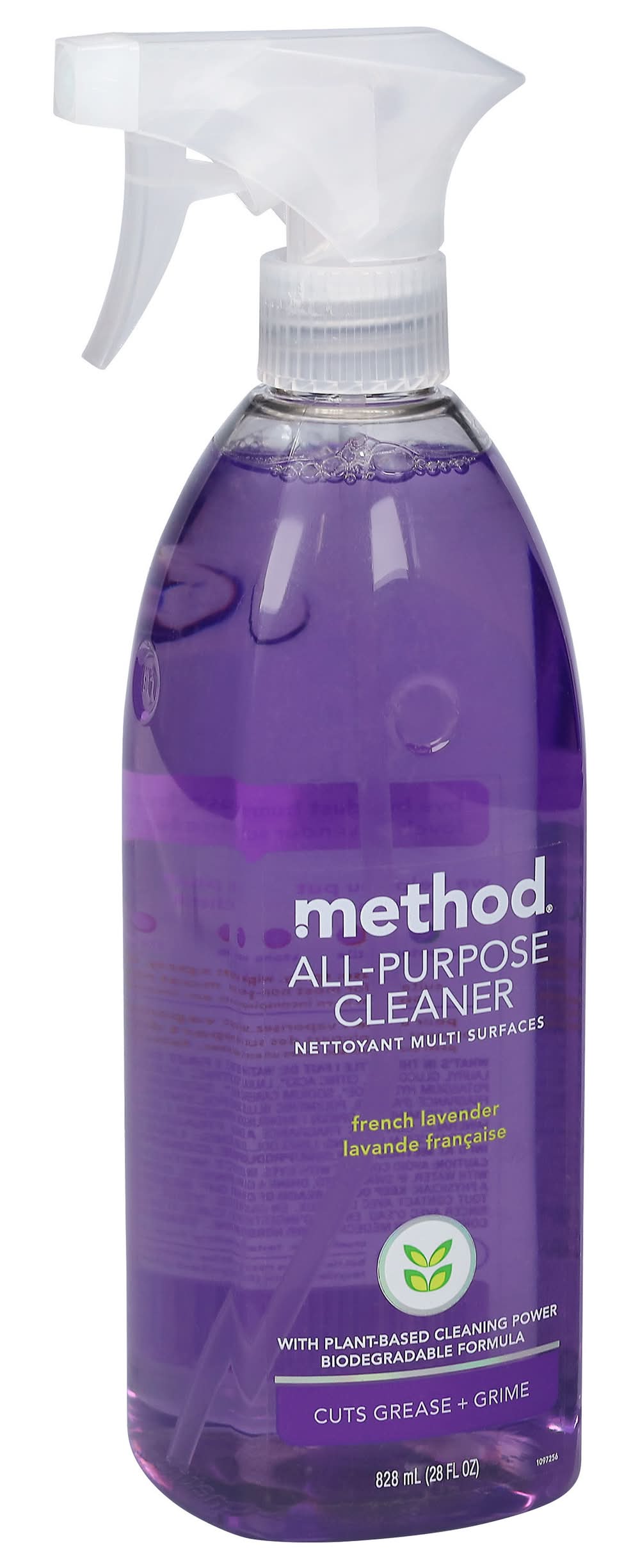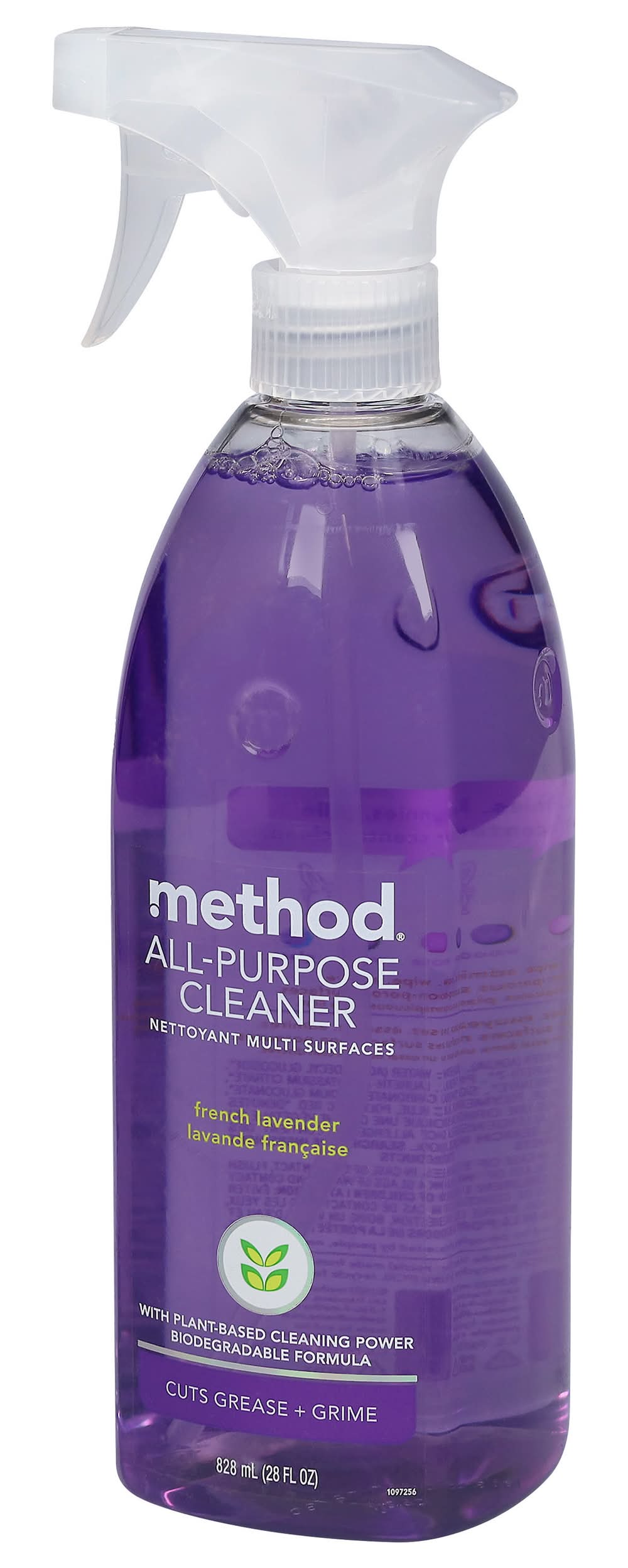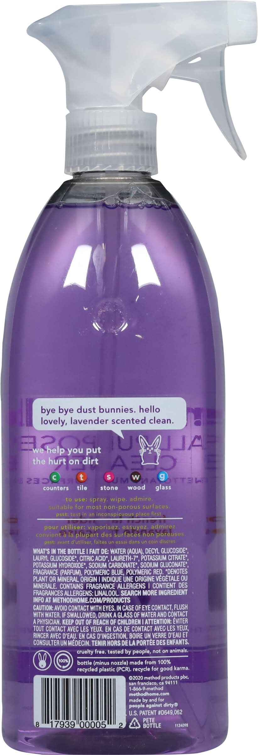With plant-based cleaning power. Cuts grease + grime. Bye bye dust bunnies. Hello lovely, lavender scented clean. We help you put the hurt on dirt. Counters; Tile; stone; wood; glass. Made by and for people against dirty Bottle (minus nozzle) made from 100% recycled plastic (PCR). Biodegradable formula. Cruelty free. Tested by people, not on animals. Recycle for good karma. • Method Products Pbc, San Francisco,CA. • Packaging: Reusable