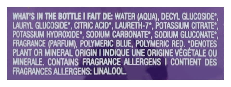 Ingredients: What's in the Bottle: Water (Aqua), Decyl Glucoside (Denotes Plant or Mineral Origin), Lauryl Glucoside (Denotes Plant or Mineral Origin), Citric Acid (Denotes Plant or Mineral Origin), Laureth-7 (Denotes Plant or Mineral Origin), Potassium Citrate (Denotes Plant or Mineral Origin), Potassium Hydroxide (Denotes Plant or Mineral Origin), Sodium Carbonate (Denotes Plant or Mineral Origin), Sodium Gluconate (Denotes Plant or Mineral Origin), Fragrance (Parfum), Polymeric Blue, Polymeric Red