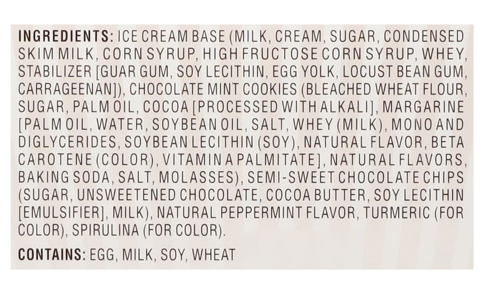 Ingredients: Ice Cream Base (Milk, Cream, Sugar, Condensed Skim Milk, Corn Syrup, High Fructose Corn Syrup, Whey, Stabilizer [Guar Gum, Soy Lecithin, Egg Yolk, Locust Bean Gum, Carrageenan]), Chocolate Mint Cookies (Bleached Wheat Flour, Sugar, Palm Oil, Cocoa [Processed with Alkali], Margarine [Palm Oil, Water, Soybean Oil, Salt, Whey (Milk), Mono and Diglycerides, Soybean Lecithin (Soy), Natural Flavor, Beta Carotene (Color), Vitamin A Palmitate], Natural Flavors, Baking Soda, Salt, Molasses), Semi-Sweet Chocolate Chips (Sugar, Unsweetened Chocolate, Cocoa Butter, Soy Lecithin [Emulsifier], Milk), Natural Peppermint Flavor, Turmeric (for Color), Spirulina (for Color) Contains: Eggs, Milk, Soybeans, Wheat, Corn