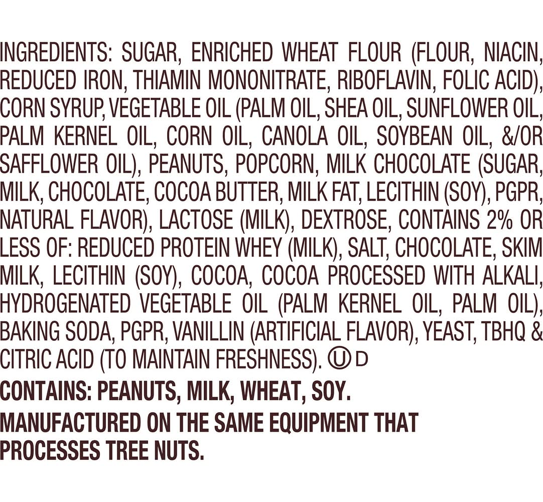 Ingredients: MILK CHOCOLATE [SUGAR; COCOA BUTTER; CHOCOLATE; SKIM MILK; MILK FAT; MILK; LACTOSE; LECITHIN (SOY); PGPR; NATURAL FLAVOR], ENRICHED WHEAT FLOUR [FLOUR; NIACIN; FERROUS SULFATE; THIAMIN MONONITRATE; RIBOFLAVIN; FOLIC ACID], CORN SYRUP, SUGAR, PEANUTS, POPCORN, DEXTROSE, CONTAINS 2% OR LESS OF: SALT, VEGETABLE OIL [CORN OIL; CANOLA OIL; SOYBEAN OIL; PALM KERNEL OIL], COCOA BUTTER, LECITHIN (SOY), HYDROGENATED VEGETABLE OIL [PALM KERNEL OIL; PALM OIL], BAKING SODA, PGPR, YEAST, TBHQ AND CITRIC ACID, TO MAINTAIN FRESHNESS Contains: Milk, Peanuts, Soybeans, Wheat, Lactose, Tree Nuts, Corn