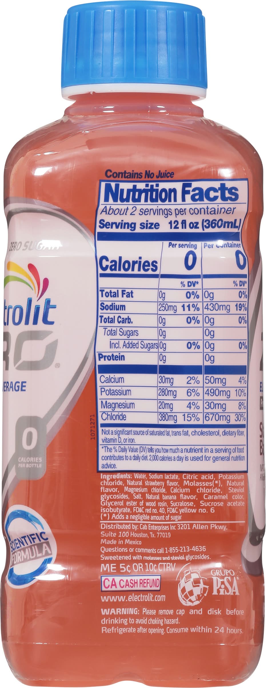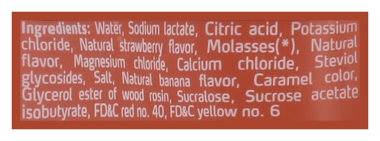 Ingredients: Water, Sodium Lactate, Citric Acid, Potassium Chloride, Natural Strawberry Flavor, Molasses(*), Natural Flavor, Magnesium Chloride, Calcium Chloride, Steviol Glycosides, Salt, Natural Banana Flavor, Caramel Color, Glycerol Ester of Wood Rosin, Sucralose, Sucrose Acetate Isobutyrate, FD&C Red 40, FD&C Yellow 6. (*) Adds a Negligible Amount of Sugar