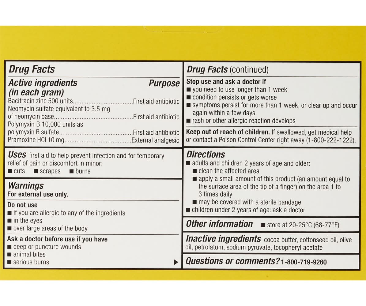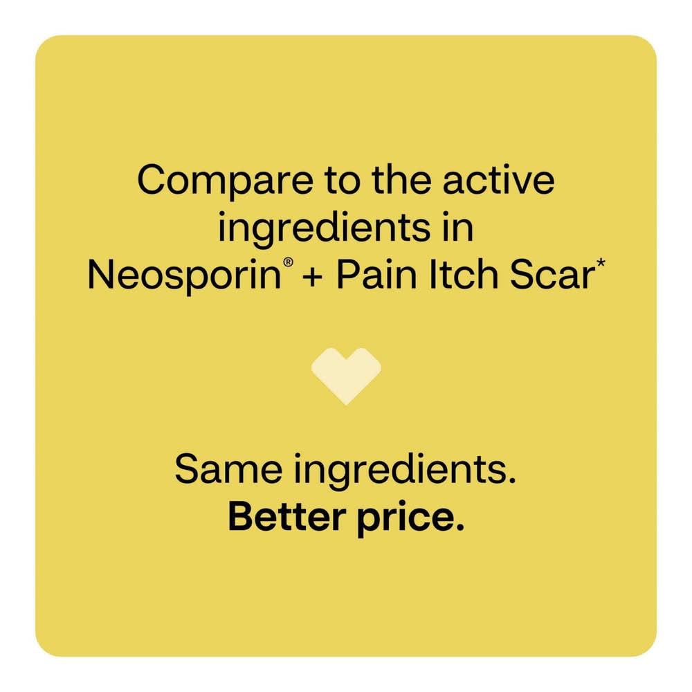 Compare to the active ingredients in Neosporin + Pain Itch Scar Ointment. Relieve itchiness and minimize the appearance of scars with Triple Antibiotic Pain + Scar Ointment. This multi-action ointment provides maximum strength pain and itch relief as well as 24 hour infection protection for minor cuts, scrapes and burns. Contains pramoxine HCl, an external analgesic, as well as bacitracin zinc, neomycin sulfate and polymyxin B sulfate, which are first aid antibiotics. ACTIVE INGREDIENTS: This product contains pramoxine HCl (external analgesic), as well as bacitracin zinc, neomycin sulfate and polymyxin B sulfate (first aid antibiotics), which compare to the active ingredients in Neosporin + Pain Itch Scar Ointment. 24 HOUR INFECTION PROTECTION: Long lasting protection against infection and for temporary relief of pain or discomfort in minor cuts, scrapes and burns. MINIMIZE THE APPEARANCE OF SCARS with this pain relieving first aid ointment while also treating pain and itch associated with minor wounds. PAIN RELIEF: Triple antibiotic protection and pain relief for cuts, itch, burns and scrapes. ITCH RELIEF: Maximum strength antibiotic ointment relieves uncomfortable itching associated with minor cuts, scrapes and burns.