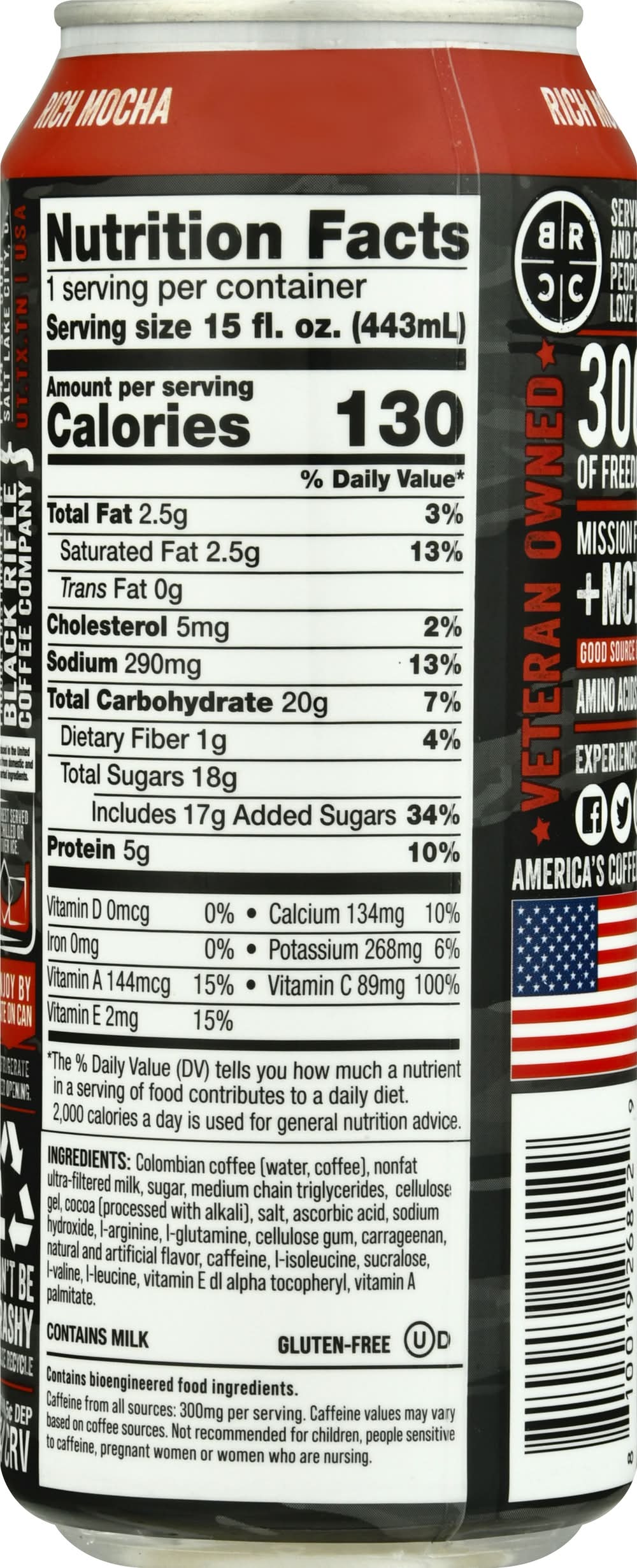 Naturally & Artificially Flavored Coffee Beverage. Gluten-Free. 300 Mg Natural Caffeine Of Freedom Fuel. Mission Focused + Mct Oil. Good Source Of Protein. Amino Acids. 100% Daily Vitamin C. Caffeine From All Sources: 300 Mg Per Serving. Caffeine Values May Vary Based On Coffee Sources. Contains Bioengineered Food Ingredients. Triple Shot. Natural Caffeine + Focus. Veteran Usa Owned. Serving Coffee And Culture To People Who Love America. America's Coffee. Flavor: Richa mocha