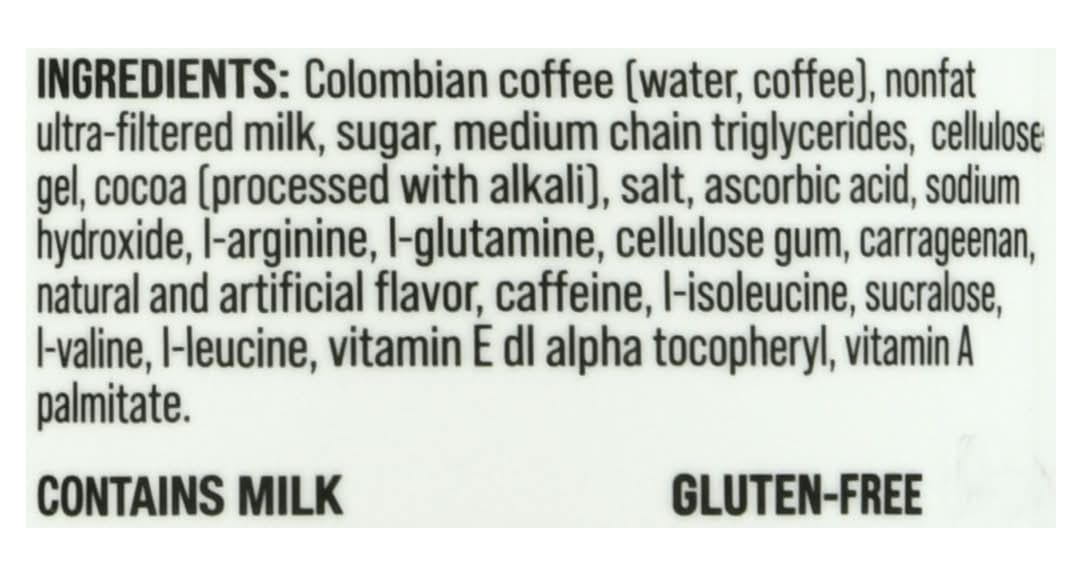 Ingredients: Colombian Coffee [Water, Coffee], Nonfat Ultra-Filtered Milk, Sugar, Medium Chain Triglycerides, Cellulose Gel, Cocoa [Processed with Alkali], Salt, Ascorbic Acid, Sodium Hydroxide, I-Arginine, I-Glutamine, Cellulose Gum, Carrageenan, Natural and Artificial Flavor, Caffeine, 1-Isoleucine, Sucralose, I-Valine, I-Leucine, Vitamin E Dl Alpha Tocopheryl, Vitamin A Palmitate Contains: Milk